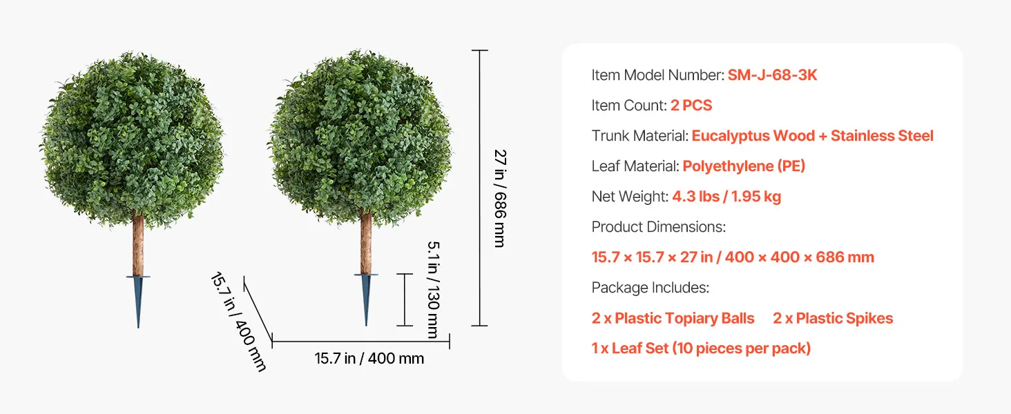 VEVOR Artificial Topiary Boxwood Trees with Ground Spike, 2 Set 686mm Faux Shrubs & Bushes Potted Plants, Fake Silk Tree Look Real for Decor Front Porch Outdoor Indoor Patio Garden Balcony Backyard