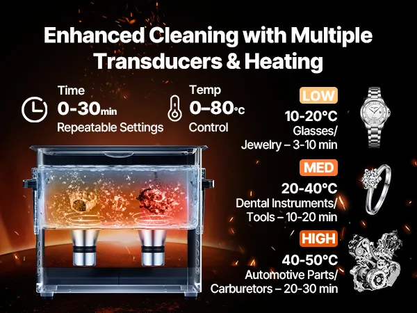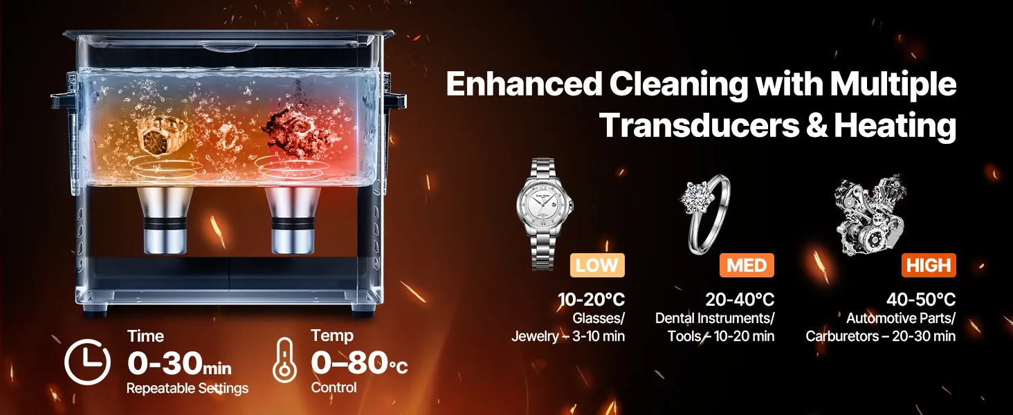 • Suitable for Multiple Materials: Ideal for jewelry, watches/electronic components, or industrial parts with heavy oil stains. Adjustable cleaning temperatures from 0–80°C accelerate the dissolution of dirt, providing a more efficient and targeted clean
