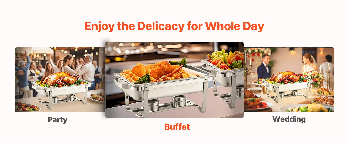 • Элегантная серебристая отделка: Современный серебристый цвет этой подогревательницы для посуды придает изысканность любому мероприятию. Будь то фуршет, вечеринка или свадьба, этот элегантный дизайн украсит сервировку вашего стола и поднимет атмосферу