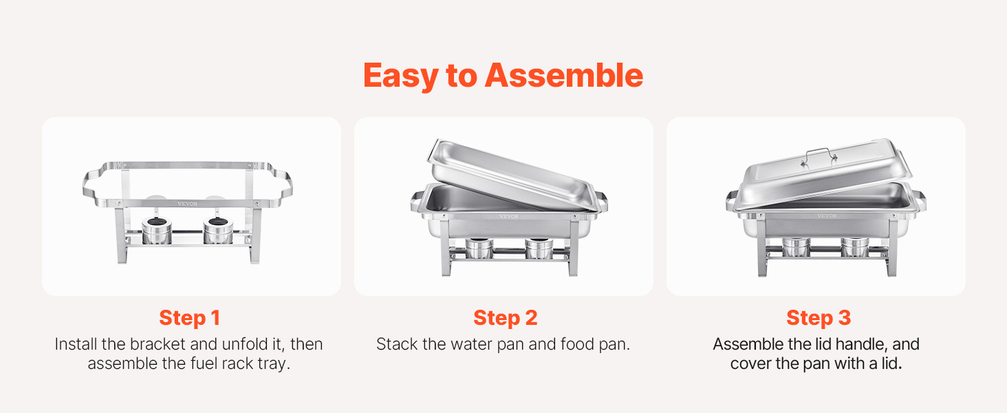 • Компактная конструкция: Этот набор для приготовления блюд на шведском столе отличается простой в сборке складной конструкцией, которая экономит ценное место для хранения. Его компактность гарантирует, что его можно удобно хранить, не занимая много места.