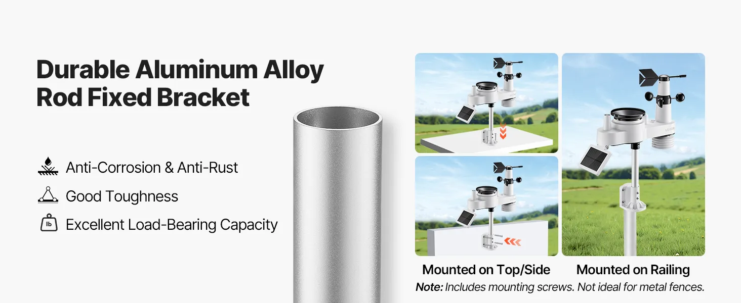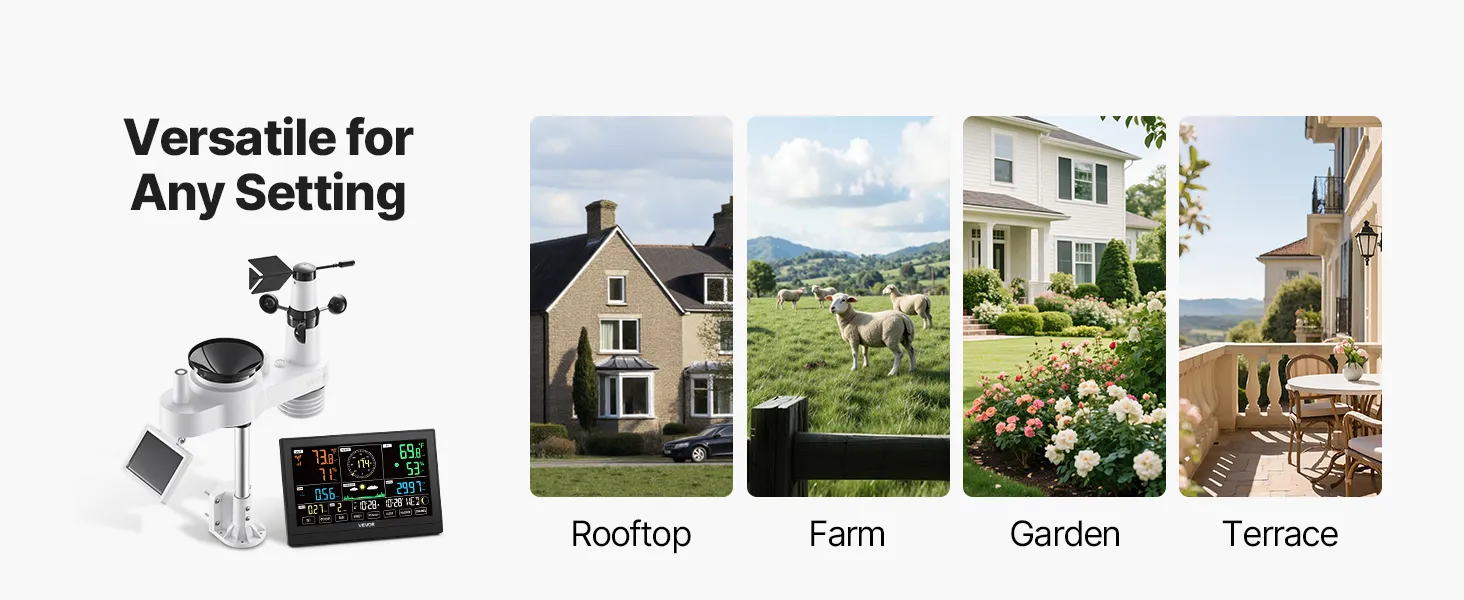 • Solar Powered, Built to Last: High-efficiency solar panels absorb solar energy during the day and charge the battery at night—cutting energy costs. Our digital weather station comes with an aluminum alloy rod fixed bracket for long-term use