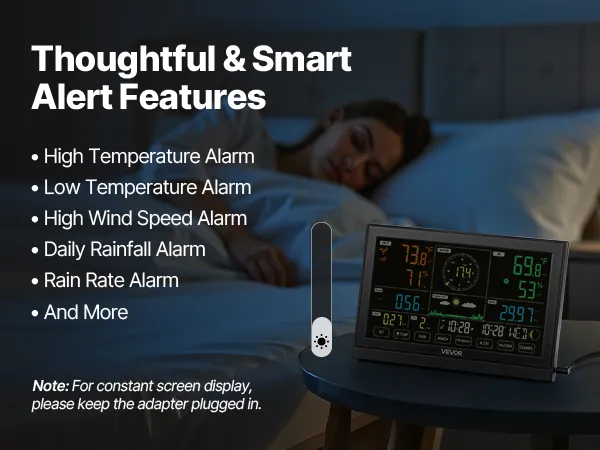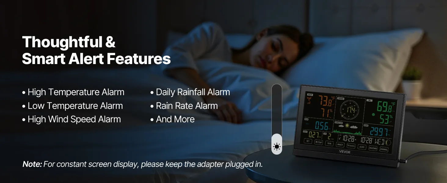 • Smart Alert Functions: Our solar powered weather station features high temperature alarm, low temperature alarm, high wind speed alarm, daily rainfall alarm, rain rate alarm, and more. Get notified in time to safeguard your property and security