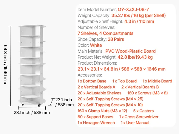 • Large-Capacity Storage: The 7-tier spinning shoe rack provides ample vertical storage to hold 28 pairs of shoes. Ideal for families or retail stores, it keeps footwear neatly arranged and maximizes vertical space utilization.