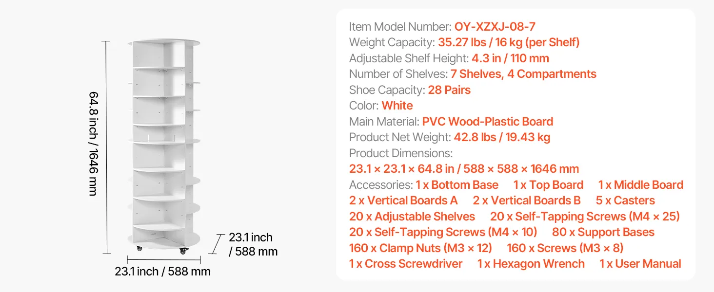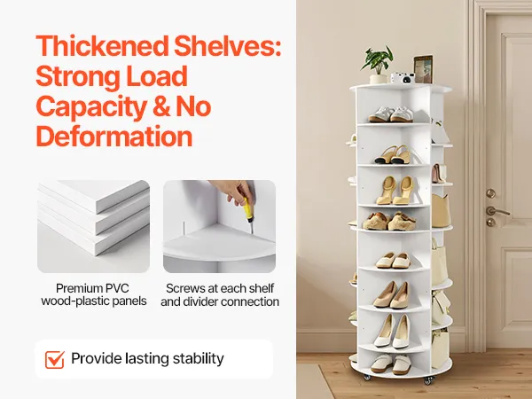 • Sturdy & Long-Lasting: The rotating shoe organizer made of PVC wood-plastic panels, each tier can bear up to 35 lbs, so you can store heavier items without worry. Its screw-fastened panels avoid slipping and wobbling. Easy to clean and maintain.