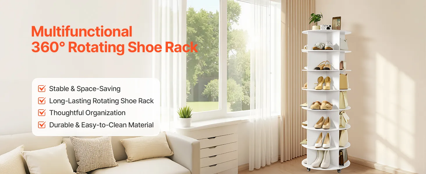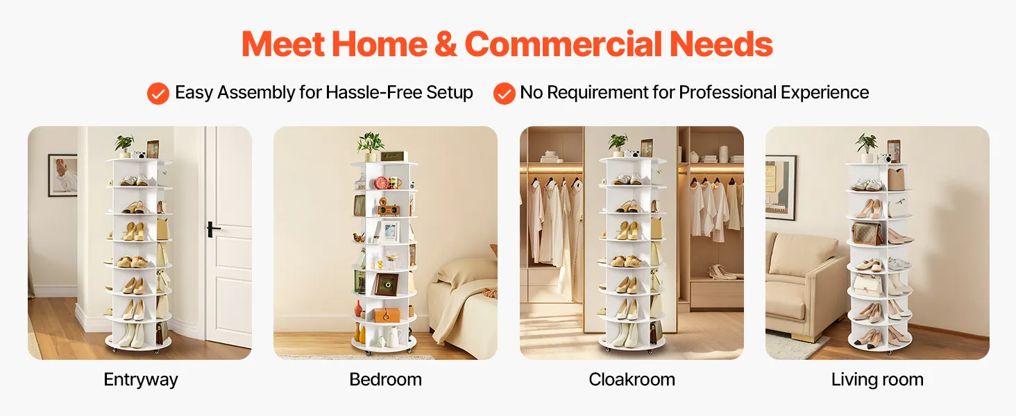 With a minimalist look and 2 classic color options, the spinning shoe rack tower fits into home foyers, wardrobes, bedroom corners, as well as store shoe areas and mall display zones—combining storage and decor. Including an illustrated manual and complete accessories, it is easy to install.