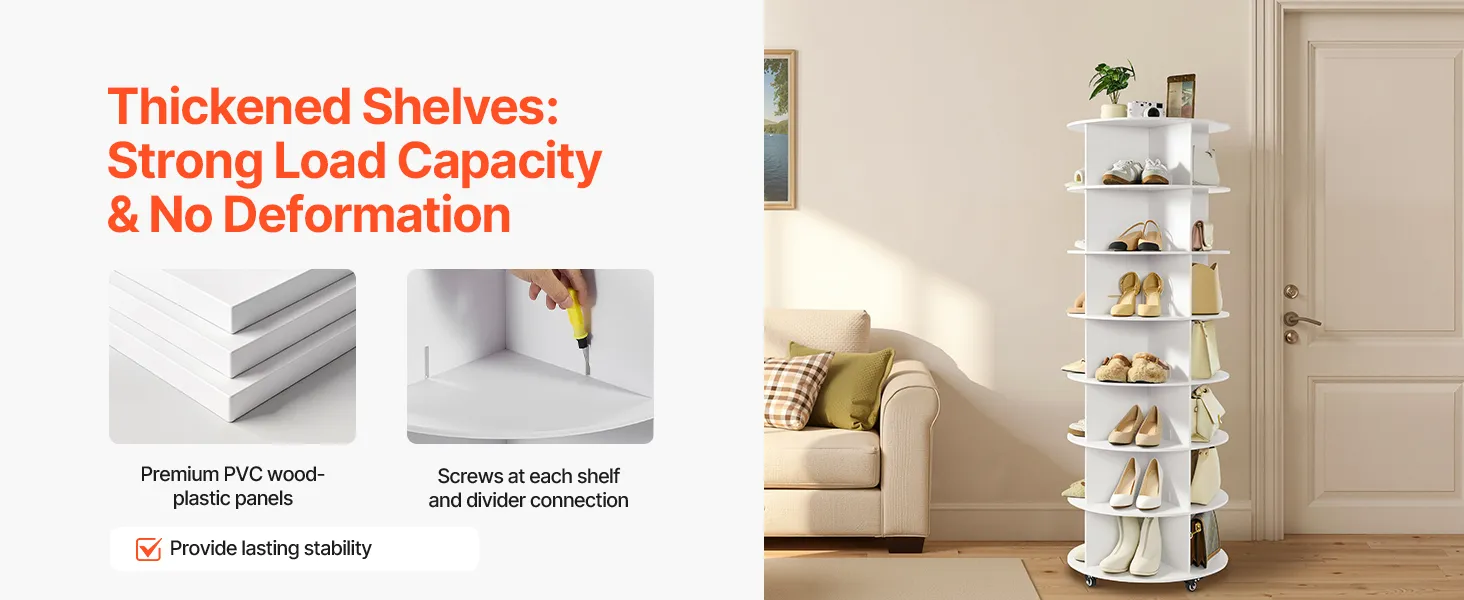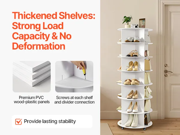 Our rotating shoe organizer features PVC wood plastic panels; each tier bears up to 26.4 lbs without bending. Panels and dividers are firmly secured with screws to avoid slipping during rotation. Stable and long-lasting for daily use, it also comes with lockable wheels for easy movement.