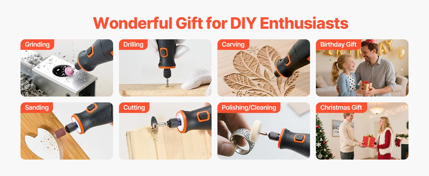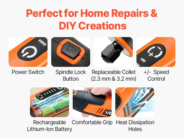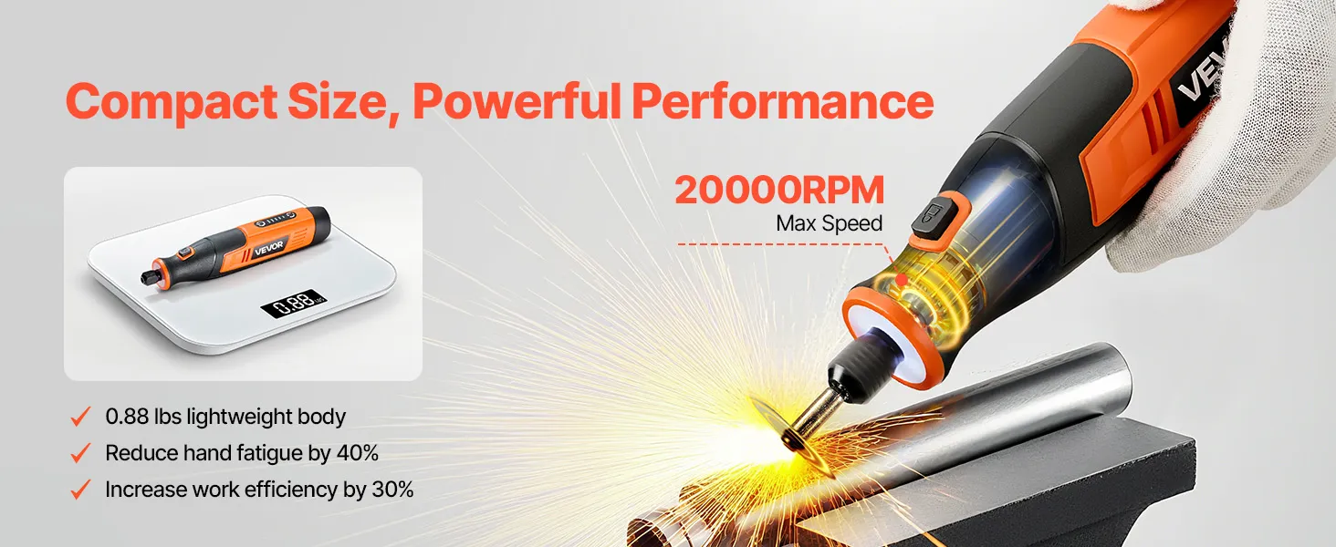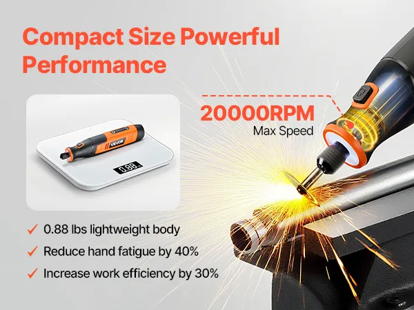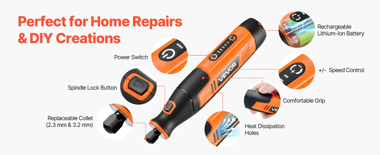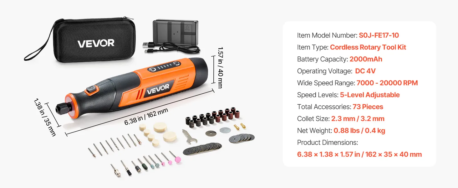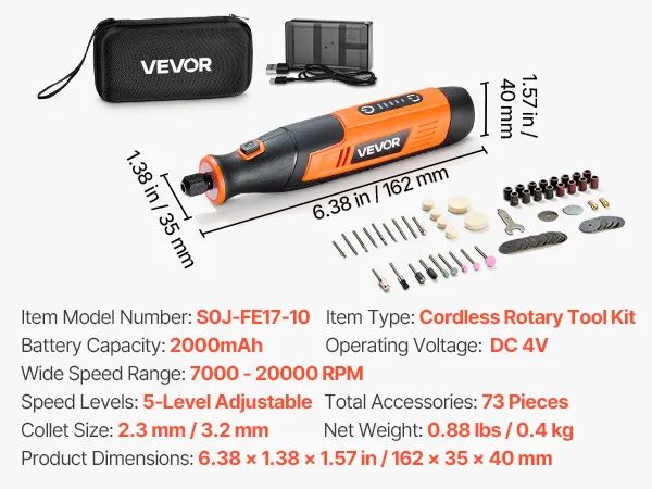 • 5-Speed Adjustable: VEVOR DC4V cordless rotary tool kit offers 5-level variable speeds (7000-20000 RPM), allowing you to select the ideal speed for fine polishing or efficient cutting. Ideal for DIYers, craftsmen, and hobbyists
