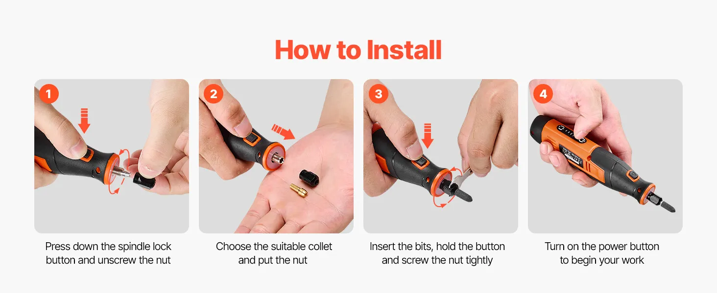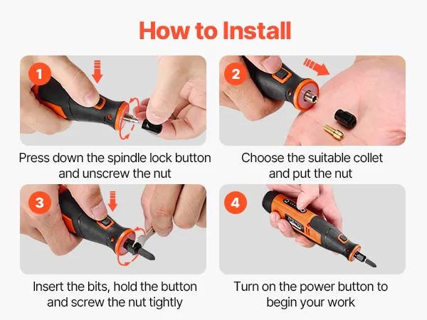 • Multi-Purpose Kit: Comes with 2.3mm (3/32″) and 3.2mm (1/8″) collets, plus a spindle lock button for fast accessory changes. Easily change different bits for household repairs, jewelry polishing, craft carving, wood sanding, cutting tasks, and more — one tool for countless applications