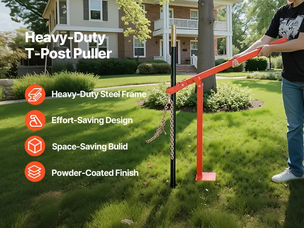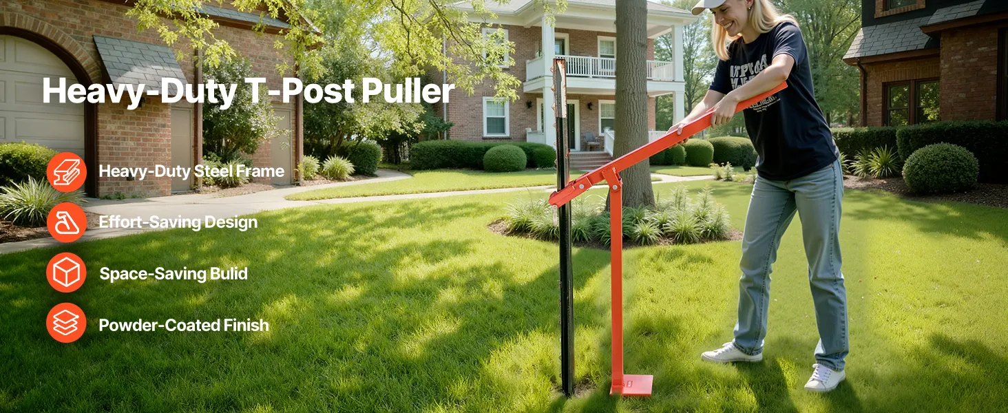 Crafted from a heavy-duty steel frame with a durable powder-coated finish to resist wear. The T post puller adopts a labor-saving lever design for easier pulling, while the upright storage saves space.