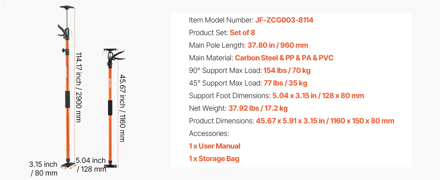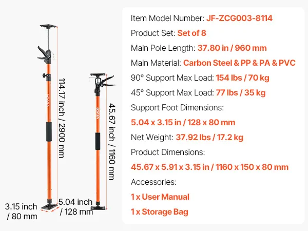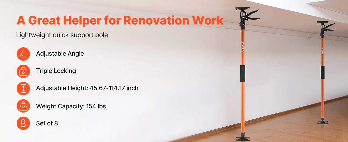 This 8-pack cabinet jack support pole set delivers efficient load support for jobsites, warehouses, and home projects. With a 154 lbs load capacity, adjustable height, and secure lock-in design, it's ideal for lifting or holding cabinets, drywall, and more.