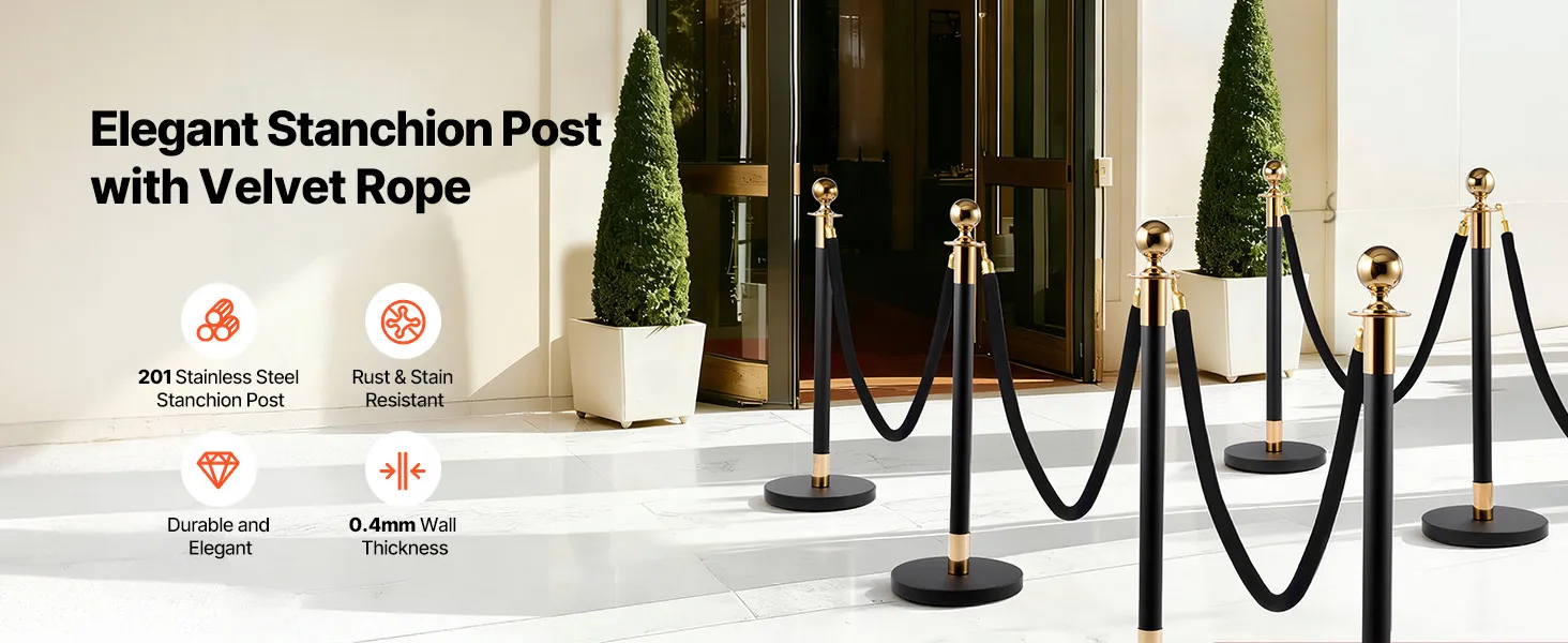 Crafted with strong 201 stainless steel, our stanchion post provides both reliability and long-lasting durability. With a sleek, minimalist design, it adds a touch of sophistication to any event, from red carpet ceremonies to balls.