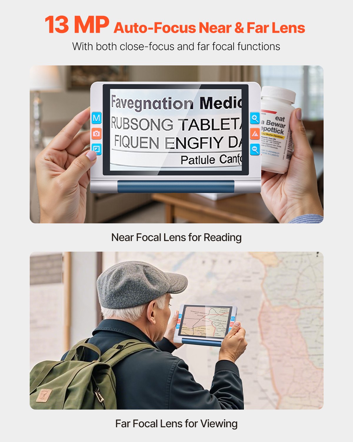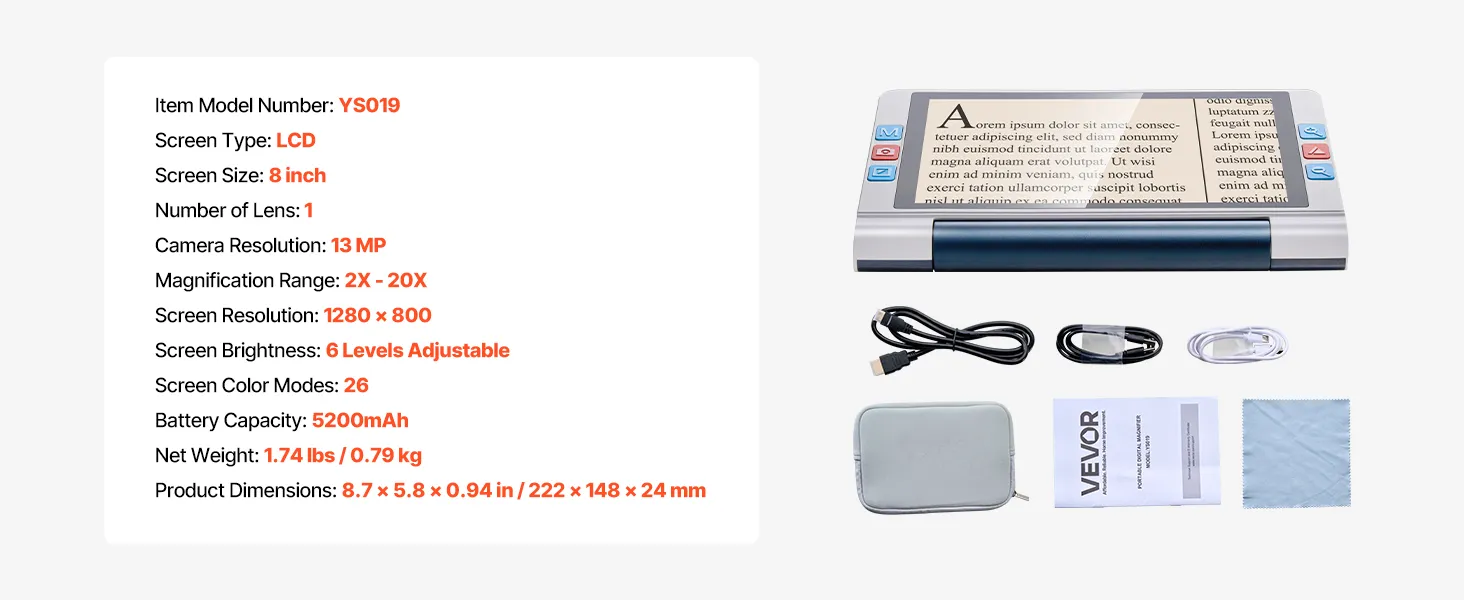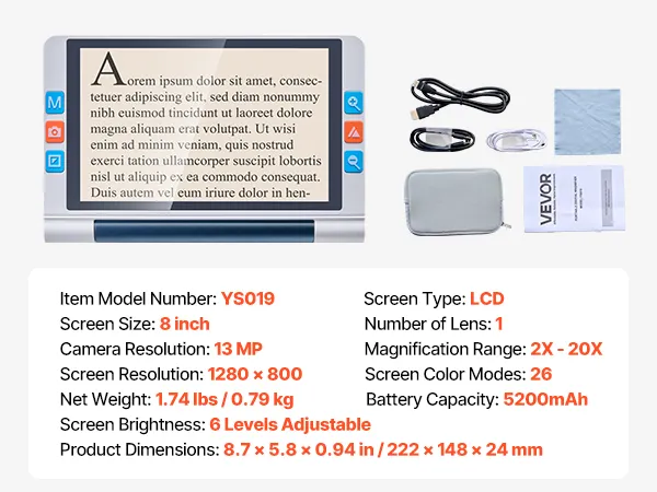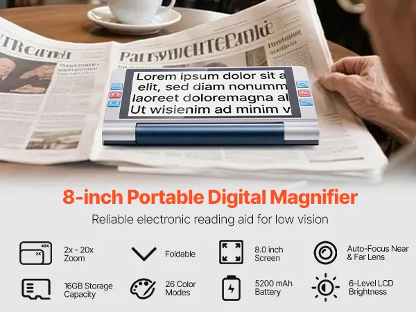 Featuring a 8.0-inch HD touchscreen, 13MP auto-focus lens, 2X to 20X magnification, 26 color modes, 6-level LCD screen brightness, HDMI output, and 5200mAh rechargeable battery, this portable digital magnifier offers comprehensive visual aid for those with low vision in reading and image viewing.