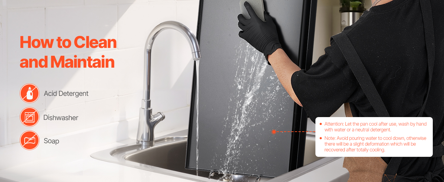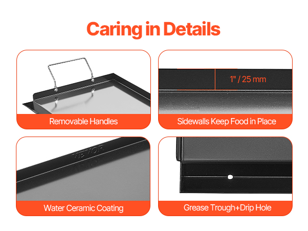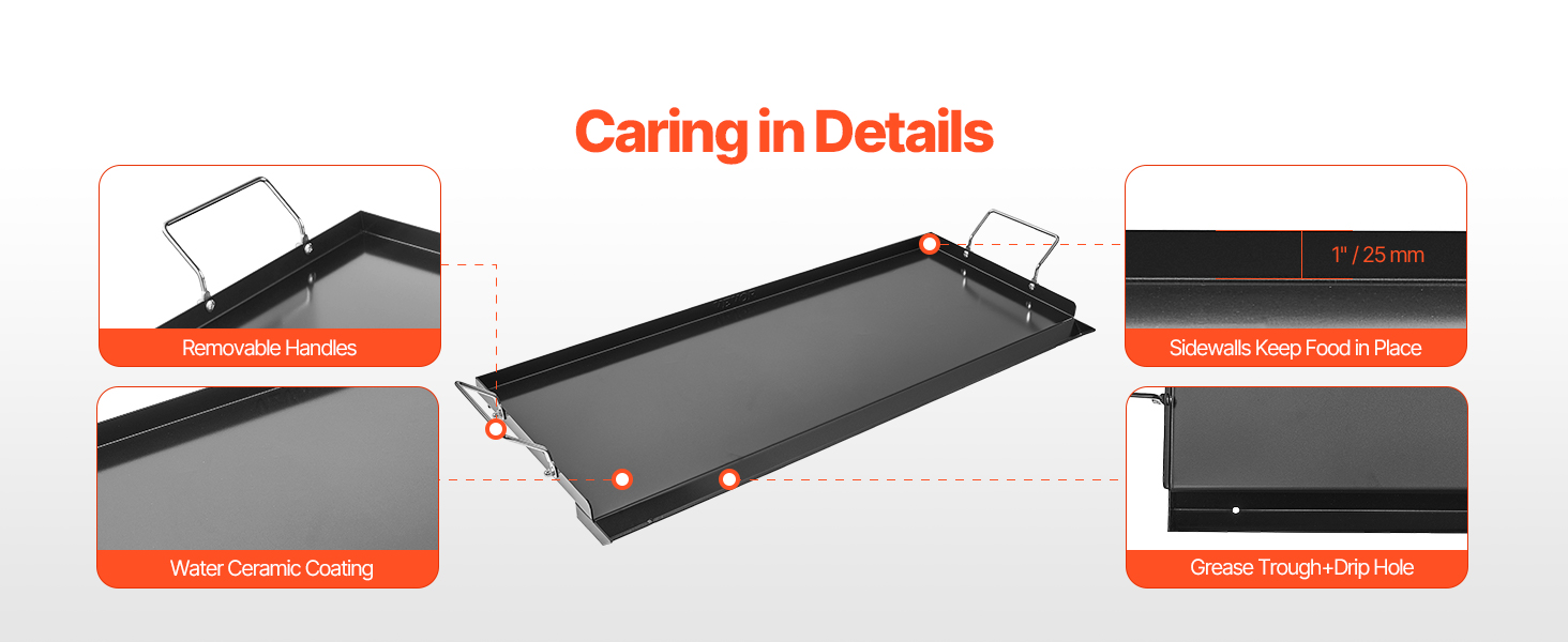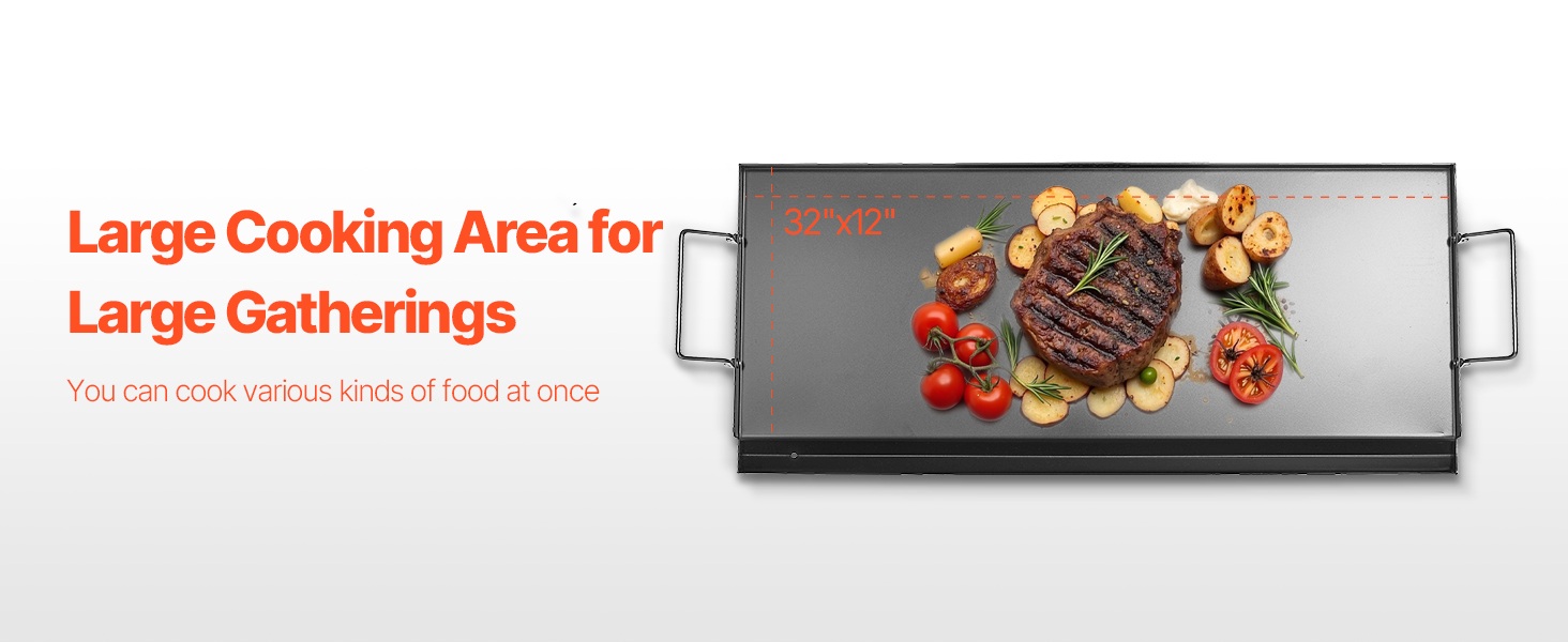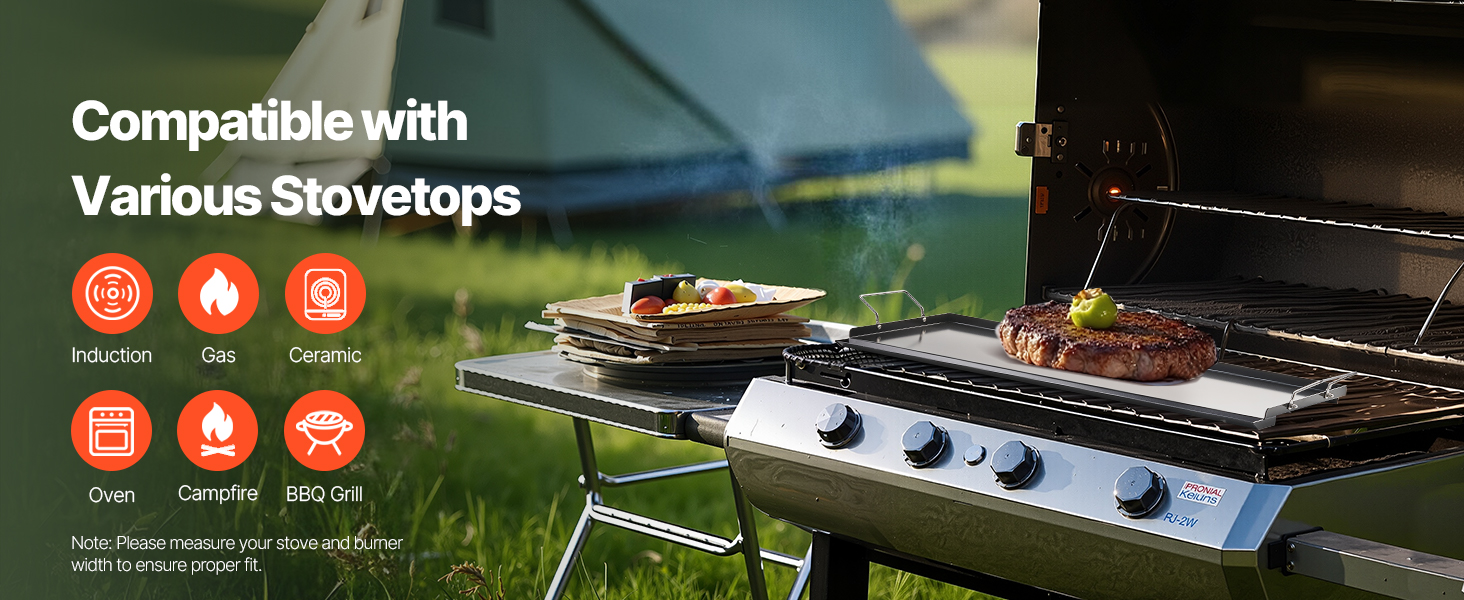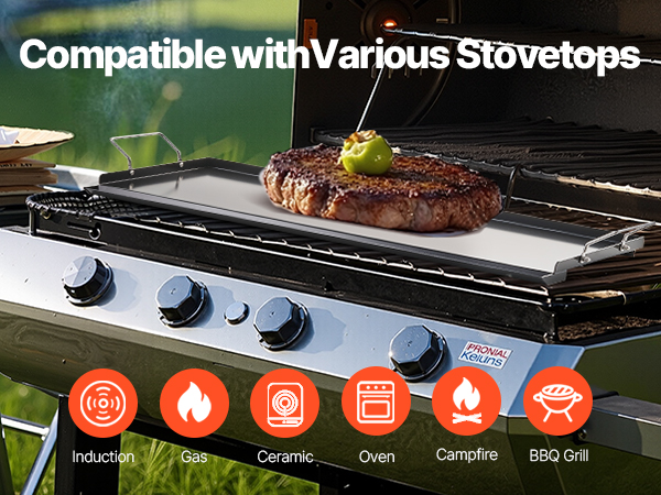 Q1: Is this griddle pan compatible with most stovetops? A1: Yes! Our griddle pan is designed to be compatible with most stovetops, including electric, and gas ranges. It also works great on outdoor grills or camping stoves, making it versatile for both indoor and outdoor cooking. Q2: Is the griddle pan easy to clean? A2: Yes! The griddle pan features a non-stick coating that makes cleaning a breeze. Simply wipe it down with a soft sponge or cloth after use. For tougher stains, soak it for a few minutes in warm soapy water, and most will come off with minimal effort. Q3: I have a 6 burner gas grill. Any recommendations to prevent warping? A3: The griddle is specifically constructed to prevent warping. There are reinforcing cross pieces on the underside. Do not place griddle in excess of 500℉. Tips:Let the griddle warm up slowly to a moderate temperature before adding food.