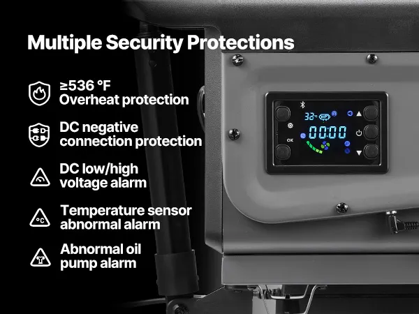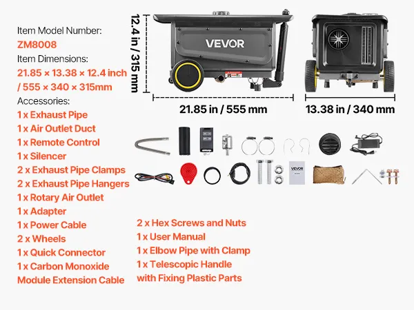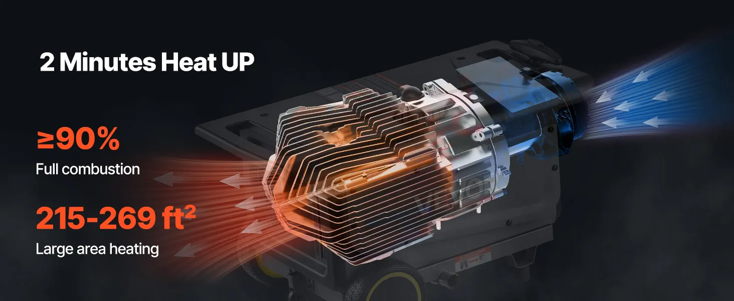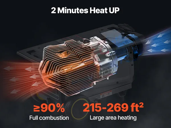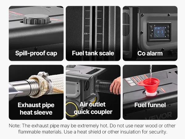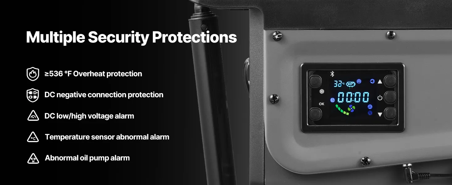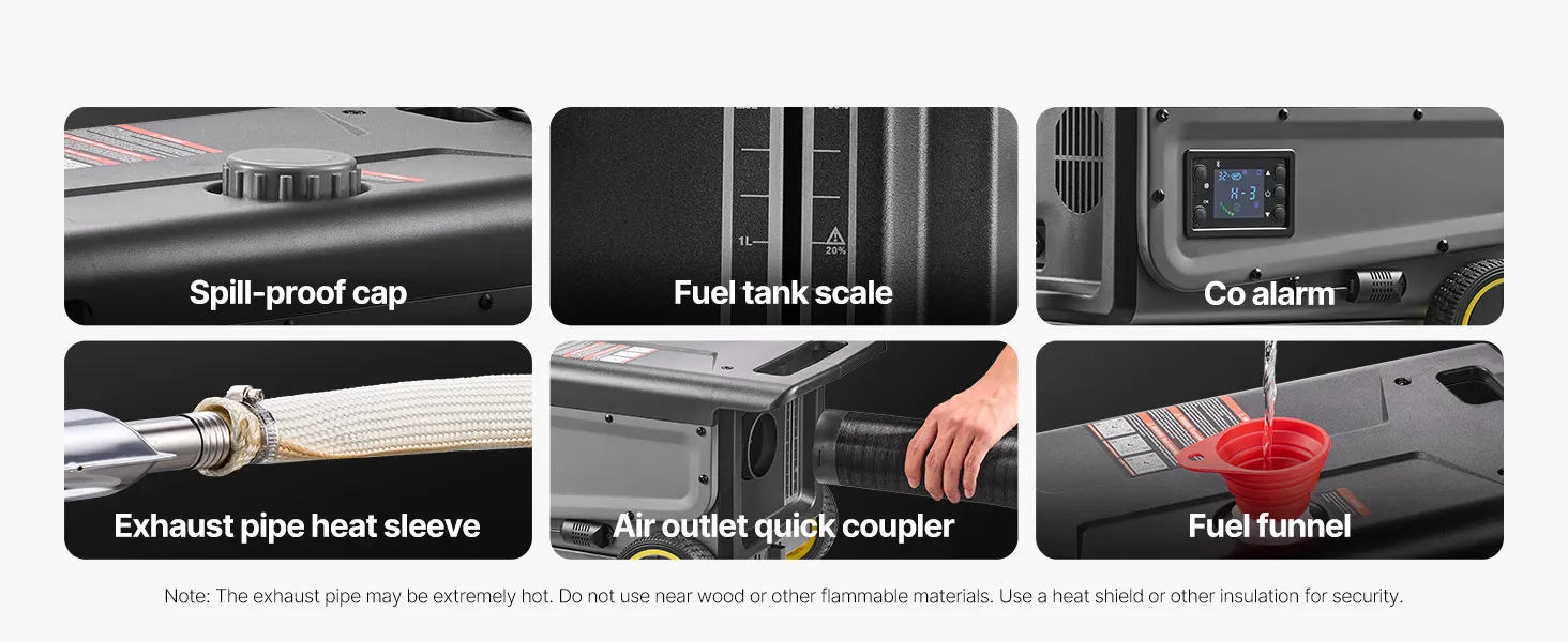 • Security Features: This diesel air heater is upgraded with CO alarm, exhaust pipe heat sleeve, and sealed fuel cap for secure long-term use. Internal board includes overheat shutoff (≥536℉), reverse polarity, and overvoltage protection