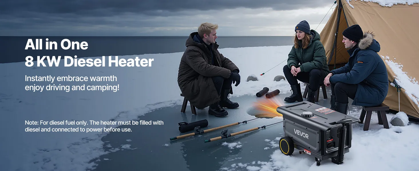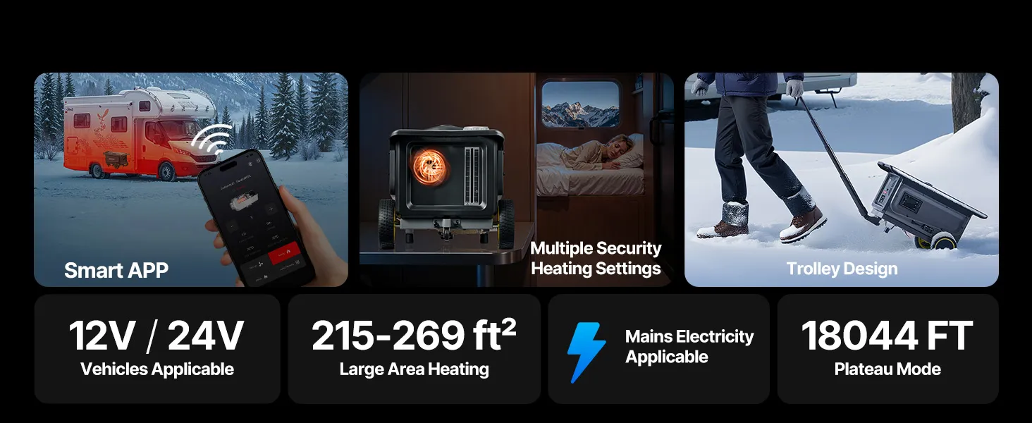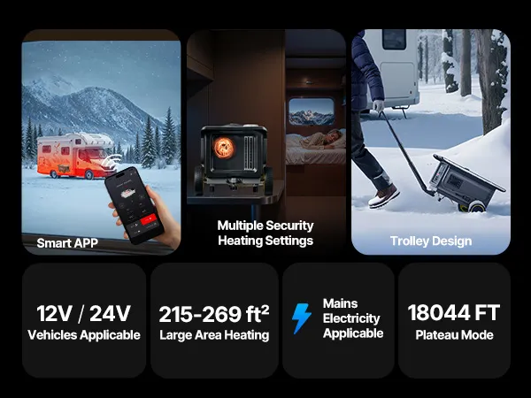 • Wide Compatibility: Our diesel parking heater is compatible with RVs, trucks, SUVs, vans, tents, and garages. It runs on 12V/24V DC or household AC power. High-altitude mode supports 9,842–18,044 ft for winter travel and everyday use