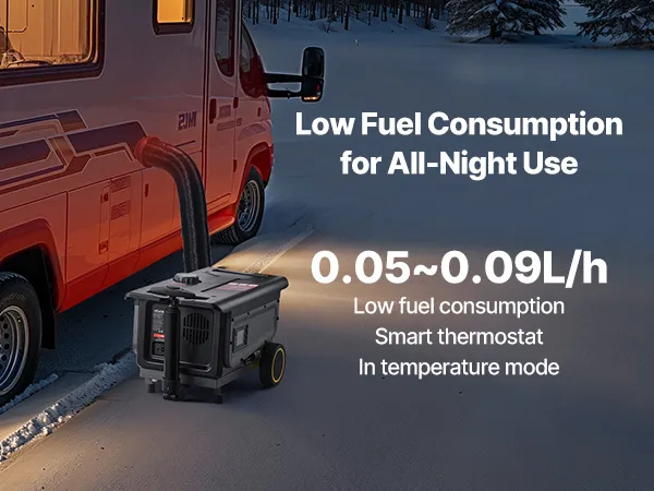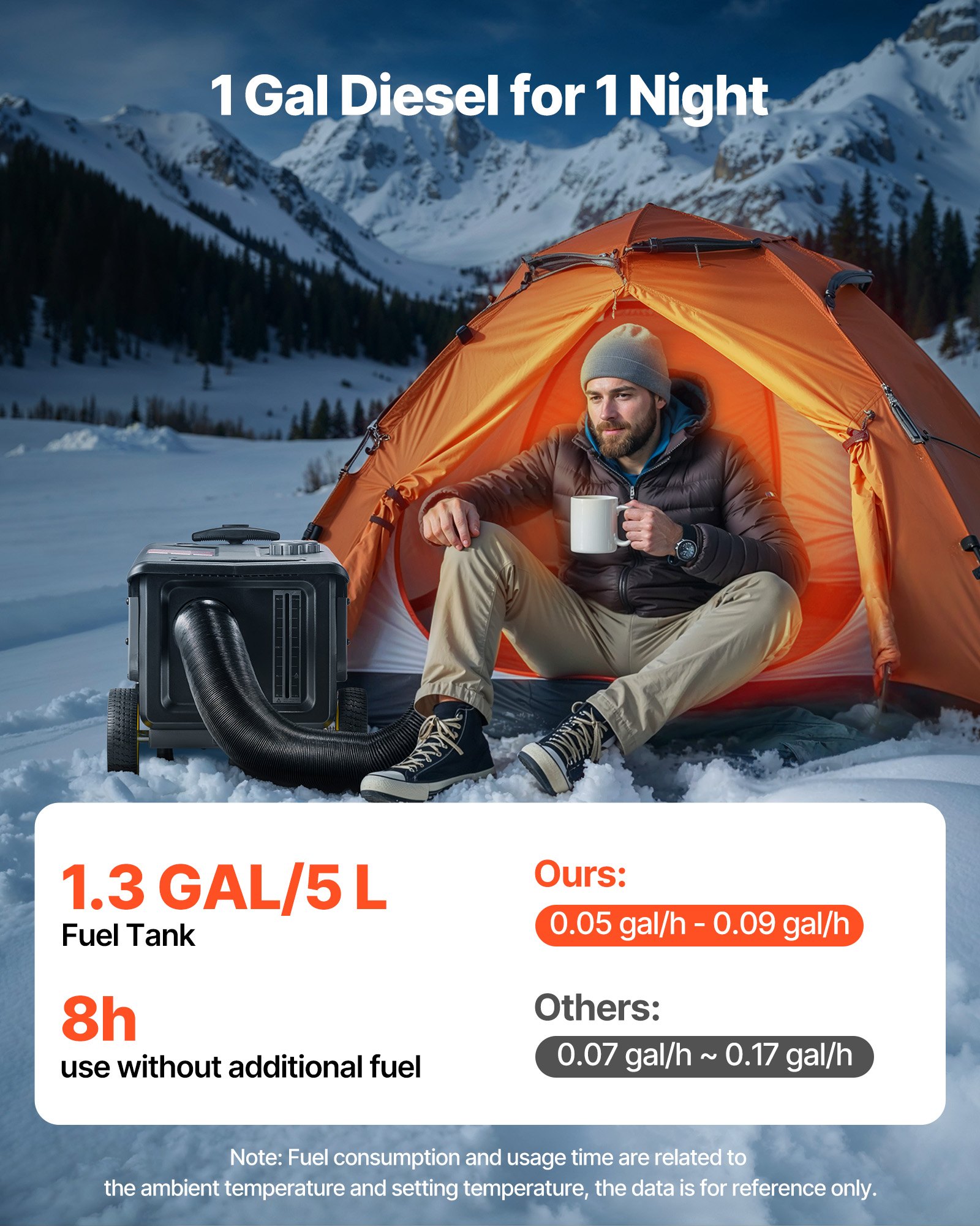 • Fuel Efficient: This portable diesel heater features a quiet, energy-saving fuel pump and burns 0.05–0.09 gal/h with over 90% efficiency. The 1.3 gal fuel tank supports all-night heating without refueling, reducing fuel use and energy waste