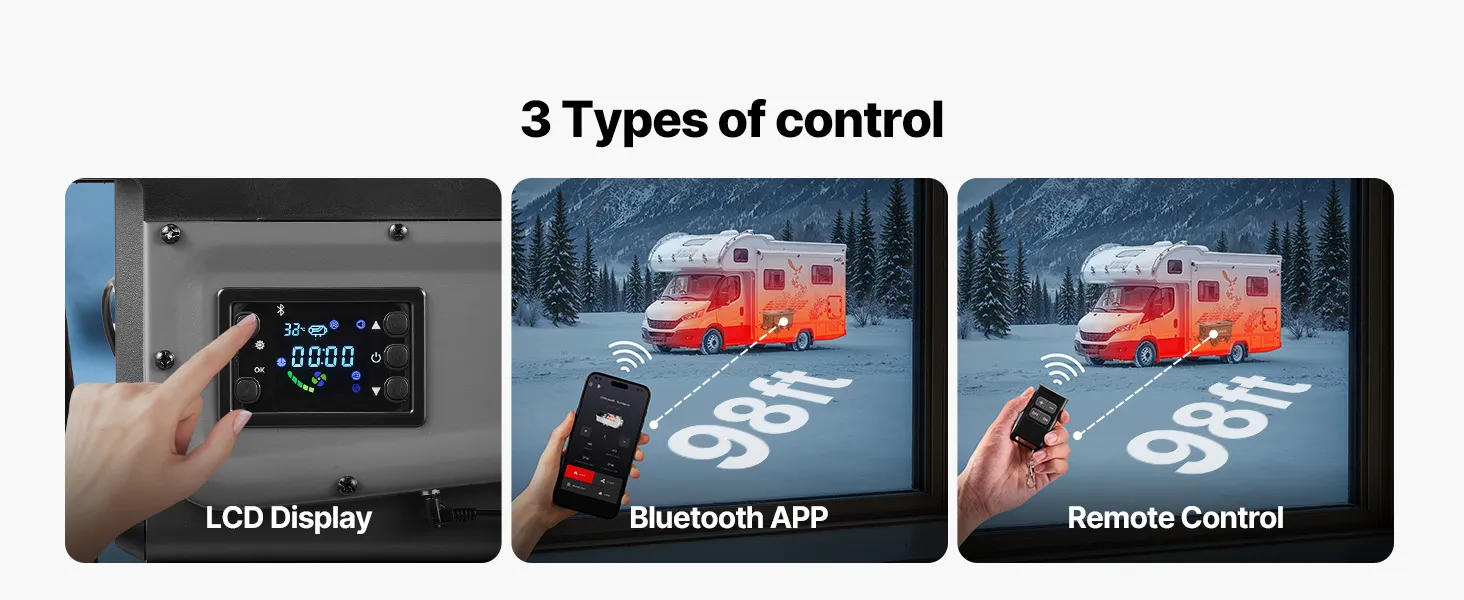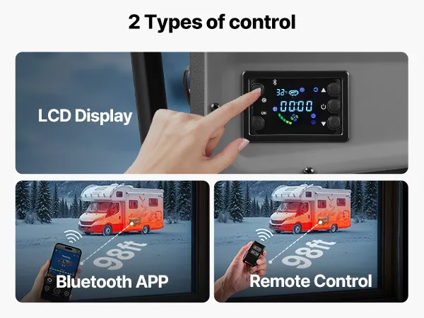 • Bluetooth App Control: This diesel fuel heater supports Bluetooth app control from up to 98 ft. Use your phone to set timers, preheat, and adjust the temperature (46.4–96.8℉). Also operable via remote control and LCD screen for added convenience