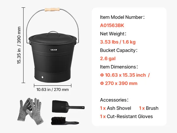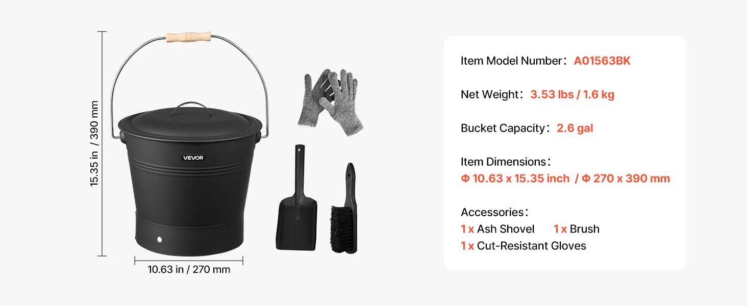 VEVOR Ash Bucket, 4 PCS with Lid, Shovel, Broom and Gloves, Metal Fireplace Charcoal Bucket and Ash Can, 9.8L Large Capacity for Fireplace, Fire Pits, Wood Burning Stoves, Indoor and Outdoor