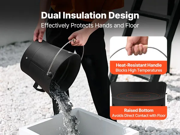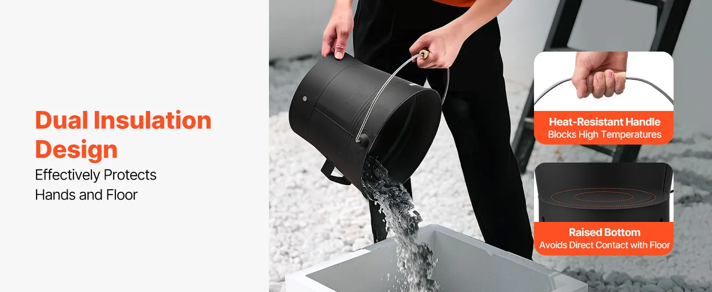 The ash bucket with lid adopts a double heat insulation design. Built with a heat-resistant handle to block high heat for hand protection. The raised bottom keeps the bucket off the floor, avoiding heat damage to the floor. This dual protection ensures secure and convenient use for you.