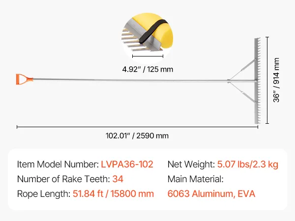 VEVOR ландшафтные грабли 914мм с ручкой 2590мм и веревкой 15.8м – Прочные грабли для сада, пруда и пляжа