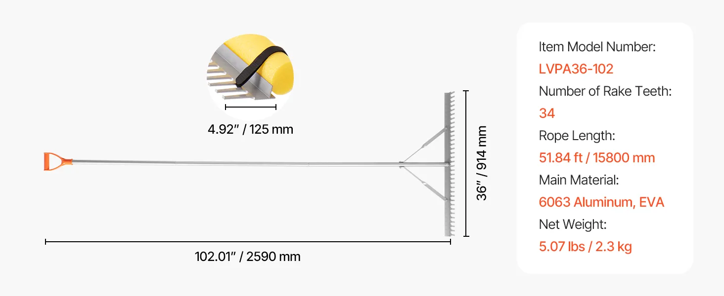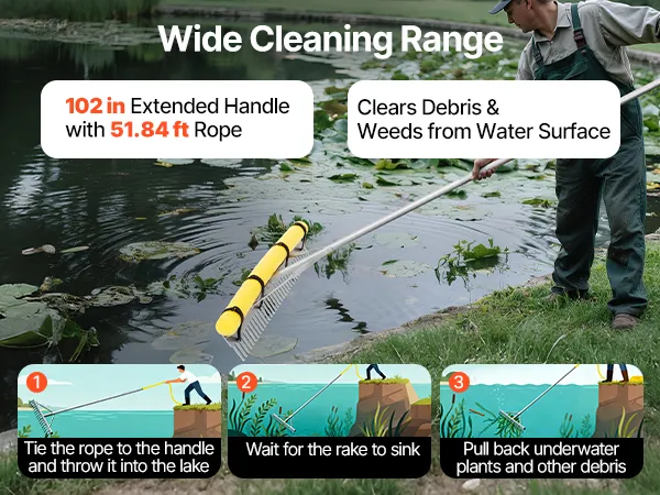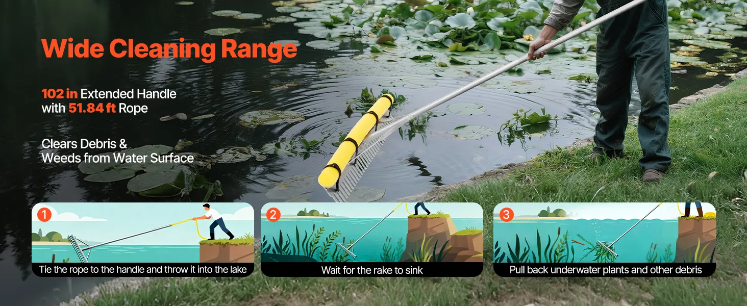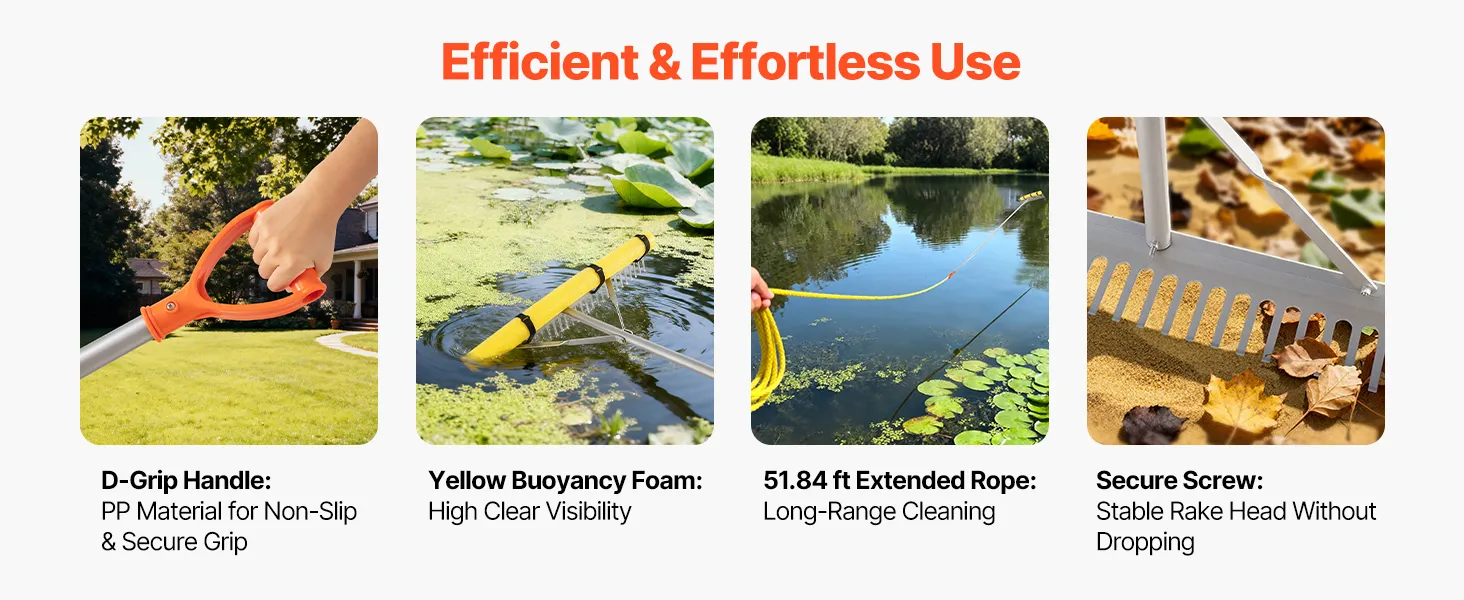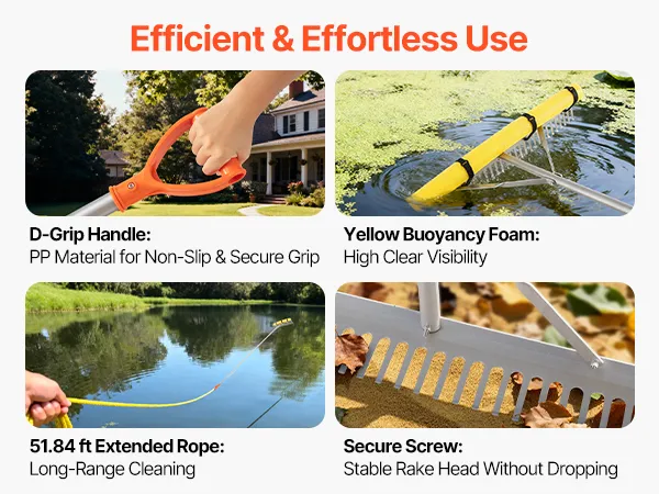 • Practical Design: Featuring a non-slip handle, the garden rake ensures a firm grip. It also comes with a 51.84 ft extension rope and a buoyant foam to make lake cleaning easier and more efficient, and secure screws to keep the rake head securely in place