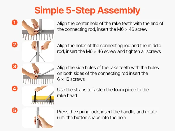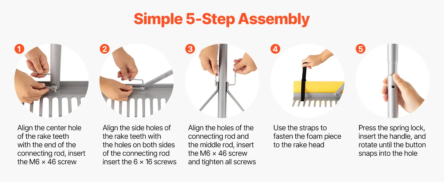 • Easy Assembly: This leaf rake requires no complicated assembly steps, saving time and effort. Its three-section spring-lock design allows quick assembly and disassembly, and the handle length can be adjusted to suit different cleaning tasks