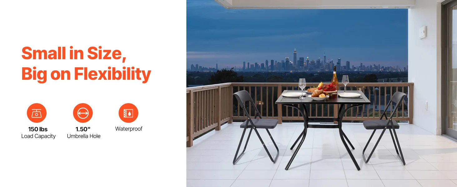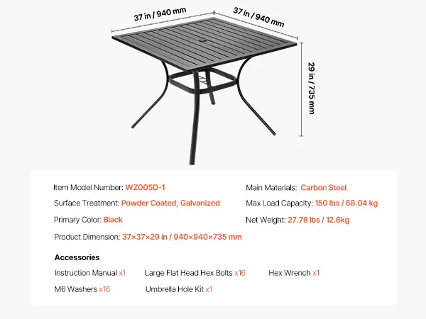 This metal outdoor dining table offers a load capacity of 150 lbs / 68 kg, providing stable support that resists tipping and deformation.