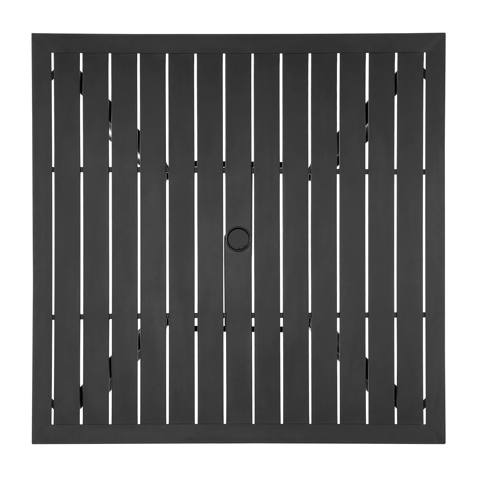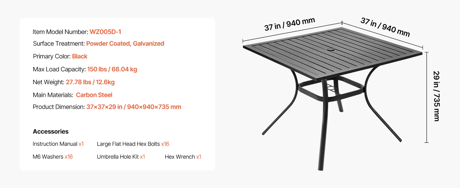 VEVOR Outdoor Patio Dining Table, 94cm Square Metal Steel Slat Backyard Bistro Tables, with 38mm Umbrella Hole, Outside All-Weather Large Furniture for Lawn Garden Porch, Black