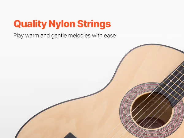 A: We provide 30", 36", and 38" classical guitars to suit players of all ages: 38" Full-Size: for adults and teens 5'3" and up. 36" Size: for kids ages 7–11, height 4'3"–4'11". 30" Size: for younger kids 4–7, height 3'7"–4'3".