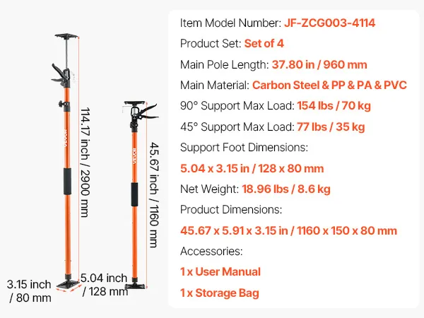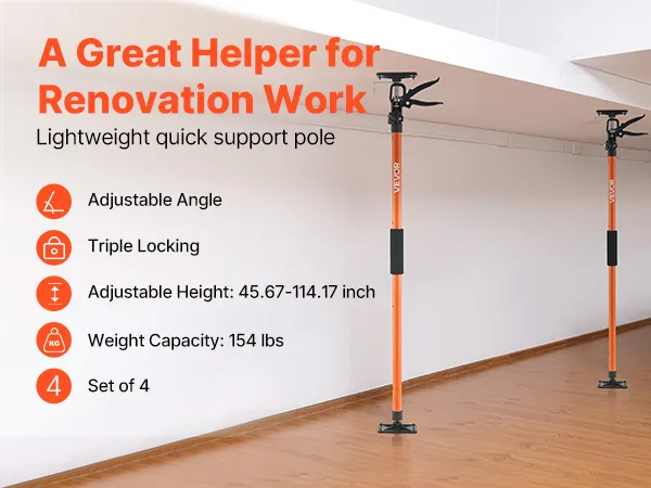 This 4-pack cabinet jack support pole set delivers efficient load support for jobsites, warehouses, and home projects. With a 154 lbs load capacity, adjustable height, and secure lock-in design, it's ideal for lifting or holding cabinets, drywall, and more.