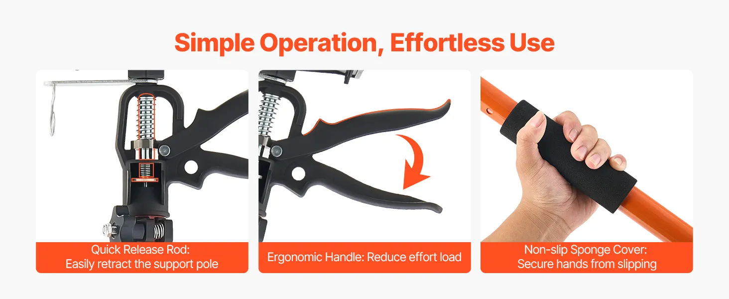 Non-slip foam grip sleeves and ergonomic nylon handles of the cabinet jacks provide a comfortable, secure hold. The quick-release lever makes setup and takedown effortless, even for solo work, ideal for frequent support tasks.