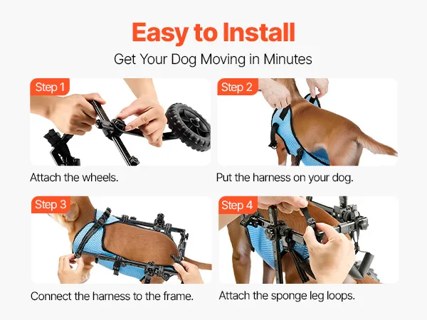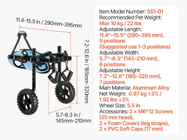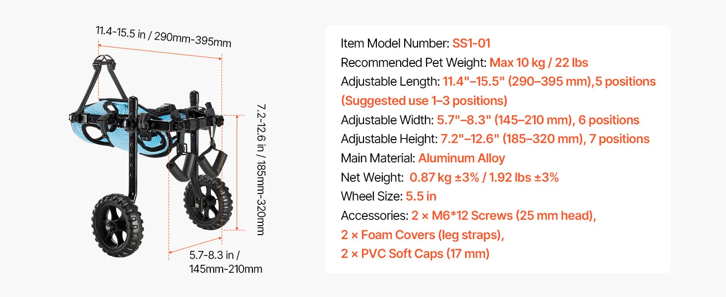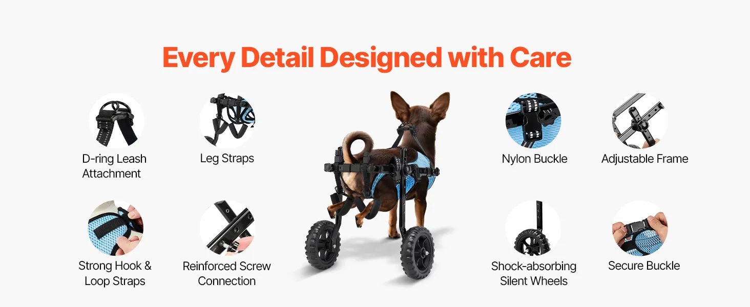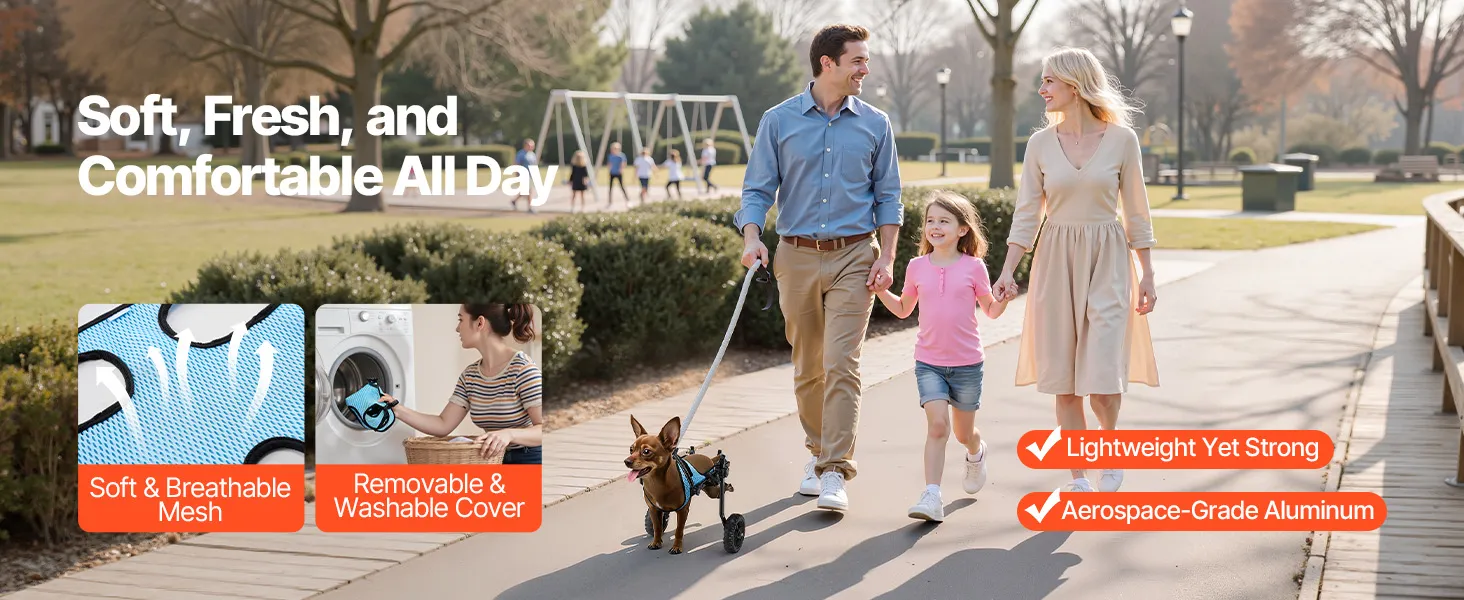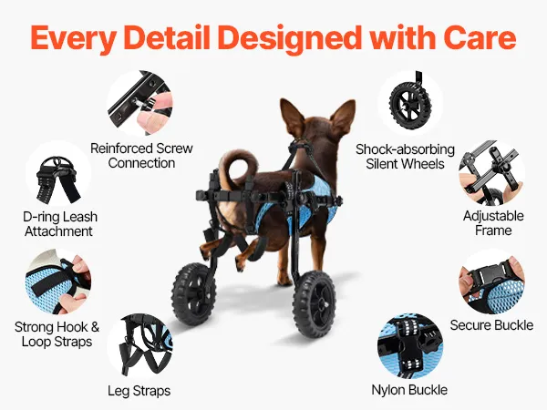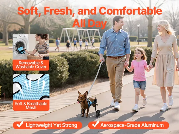• Thoughtful Comfort & Security Details: pet wheelchair comes with breathable, removable mesh that keeps your dog cool and clean. Shock-absorbing silent wheels with EVA tires reduce bumps, while reinforced screws, D-rings, and strong hook-and-loop straps ensure stability and security.