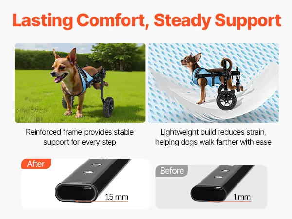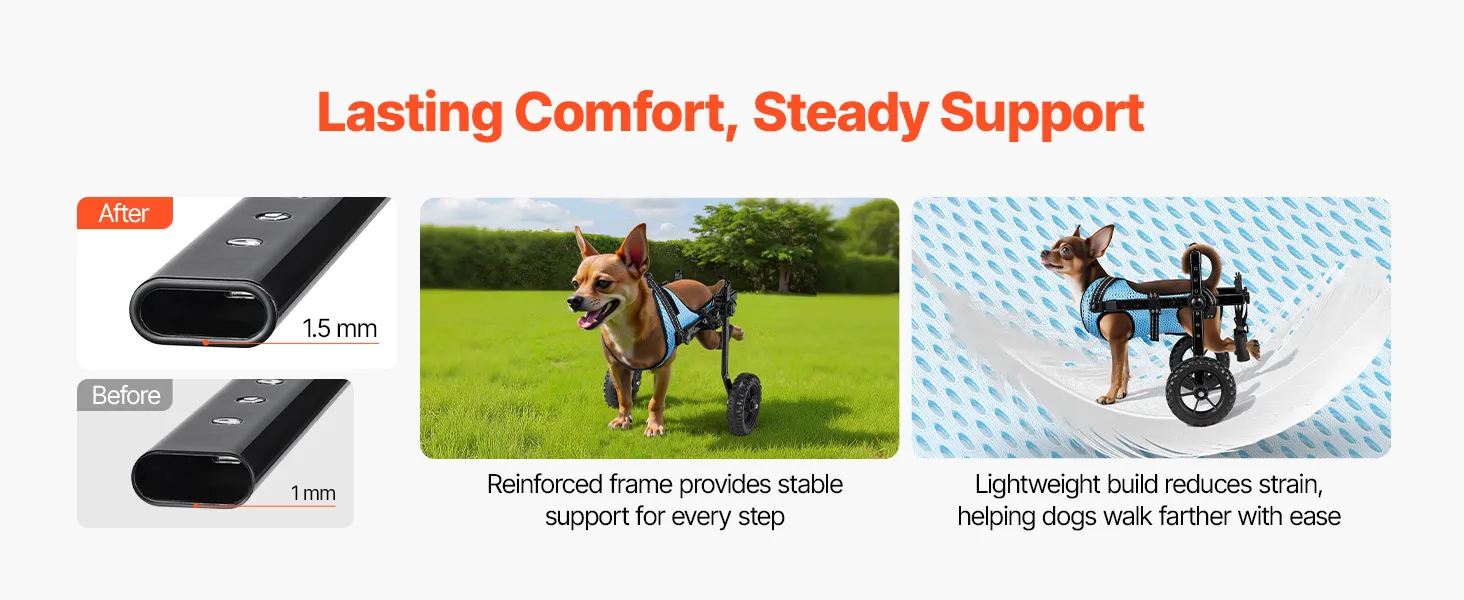 • Lightweight Yet Durable Frame: Built with a reinforced 1.5 mm thickened tube, stronger than standard 1 mm frames. The dog wheelchair cart with lightweight structure reduces walking pressure while ensuring durability, so your dog can move farther with less effort.