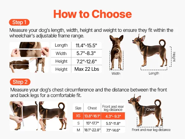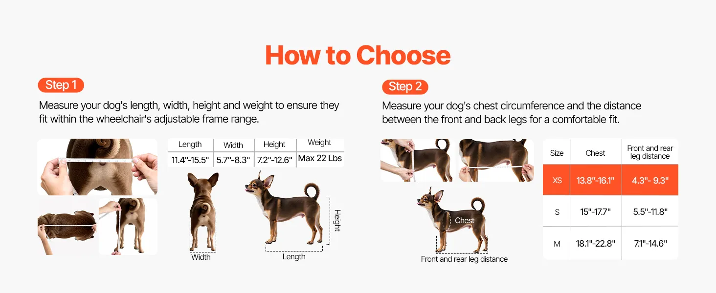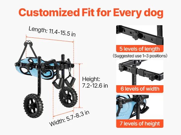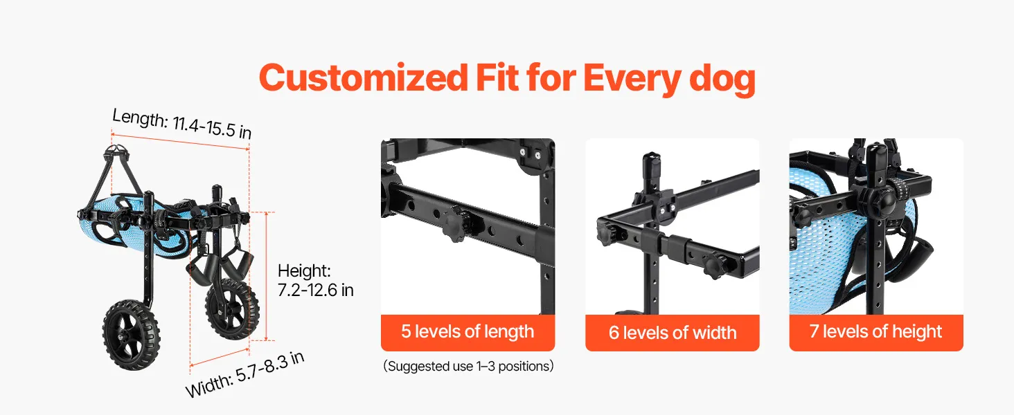 • Multi-level Adjustable & Comfort Fit: The dog wheel chair features 5 adjustable lengths, 6 widths, and 7 heights to match your dog’s body precisely. Balanced support avoids leg pinching and skin irritation, offering a more comfortable, customized fit.