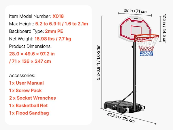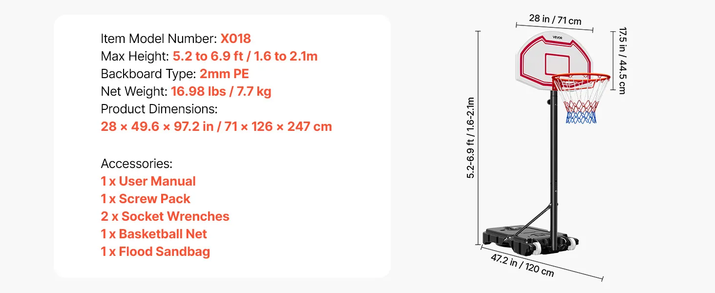This portable basketball stand brings pro-level play home. Reinforced steel and PE backboard handle every impact. Clear backboard boosts shot accuracy, and the durable net stands up to all weather. Includes a sandbag (sand not included) for extra stability. Designed for kids 6+.