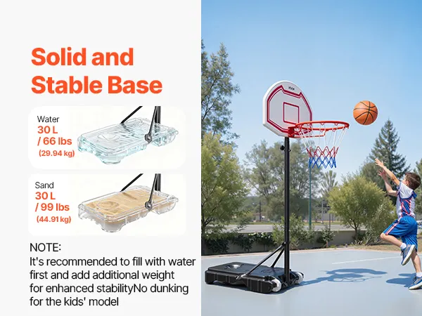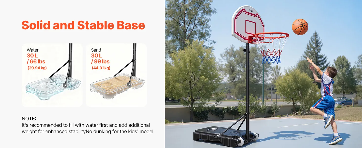 This outdoor basketball hoop adjustable comes with a thick, sturdy base. You can fill the base with water or sand, creating a solid foundation for every game. Designed to support dynamic play and enhance stability, it keeps your hoop steady during jumps, shots, and drills.