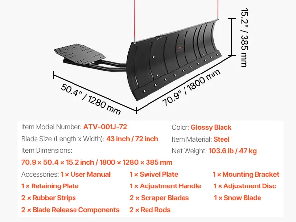 VEVOR Snow Plow Blade, 109/183 cm Width Adjustable Snow Plow Kit, Easy to Detach, Universal Mount Plowing Attachment with Rubber Flaps, Heavy Duty Steel Blade, Compatible with Most UTV & ATV