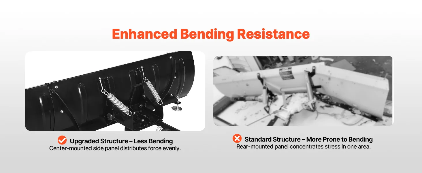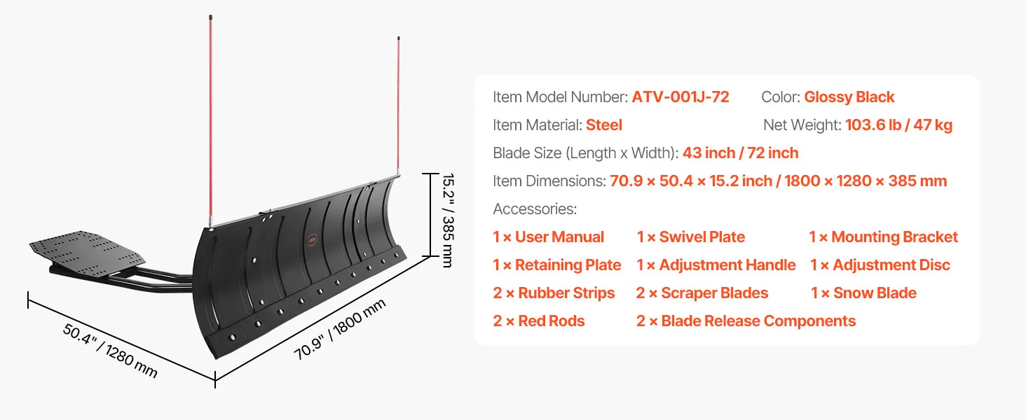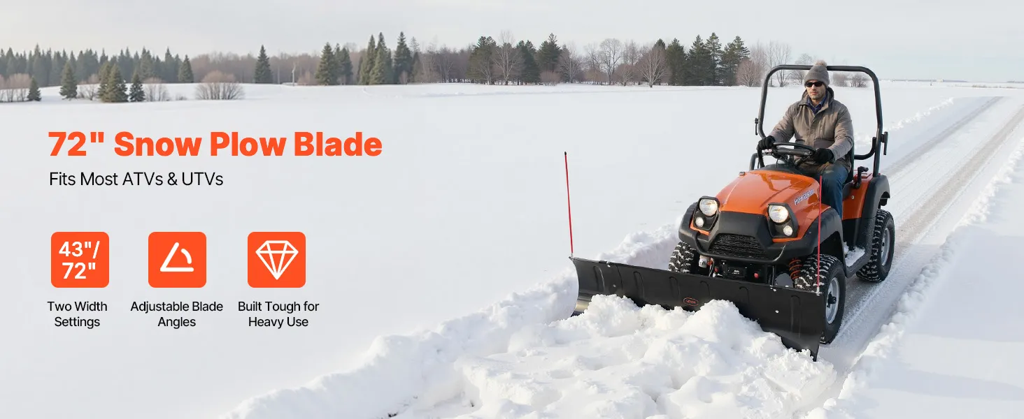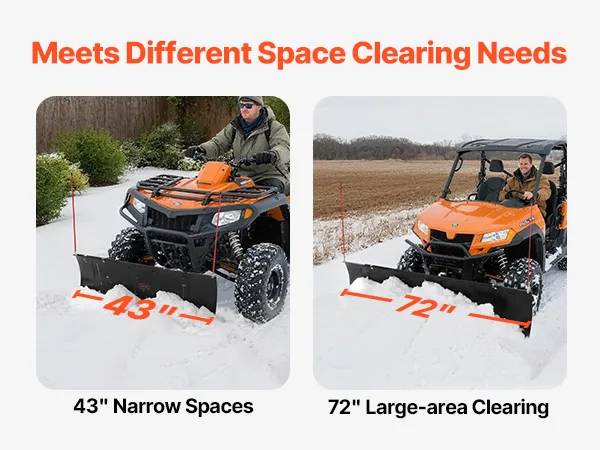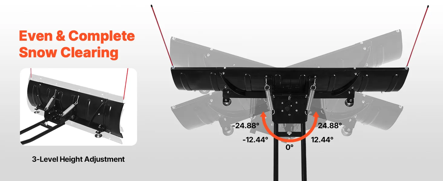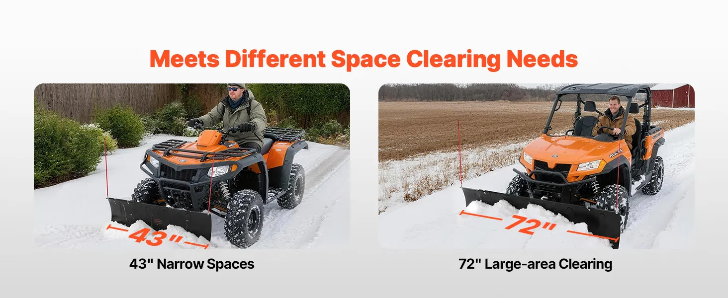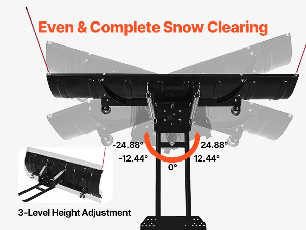 Our snow plow is designed for wide vehicle compatibility, featuring multi-slot backrest for 3 mounting options to fit most ATV and UTV models. The 2 adjustable width 43"/72", combined with 5-position angle control (±24.88°) and 4-level height adjustment, for various conditions.