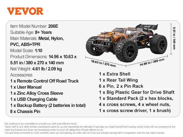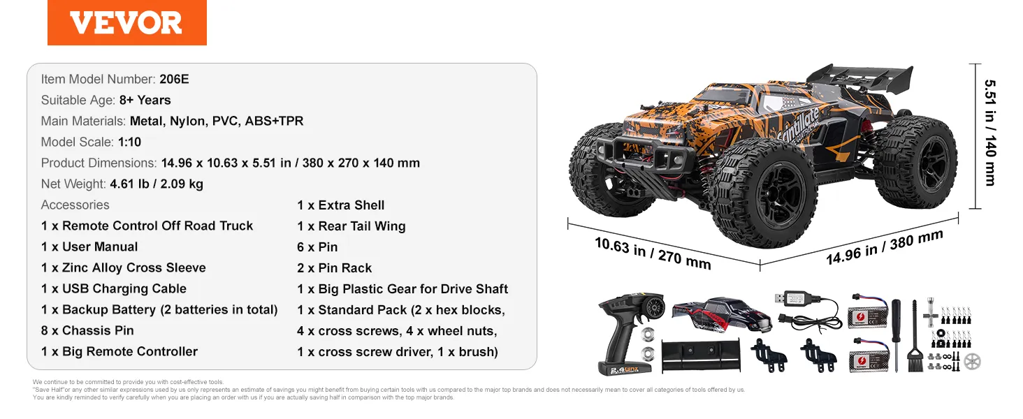 VEVOR Remote Control Car 1:10 Scale All Terrain 4WD Off-Road Truck for Kids