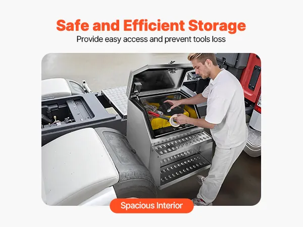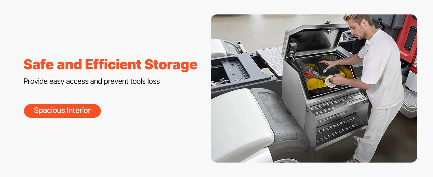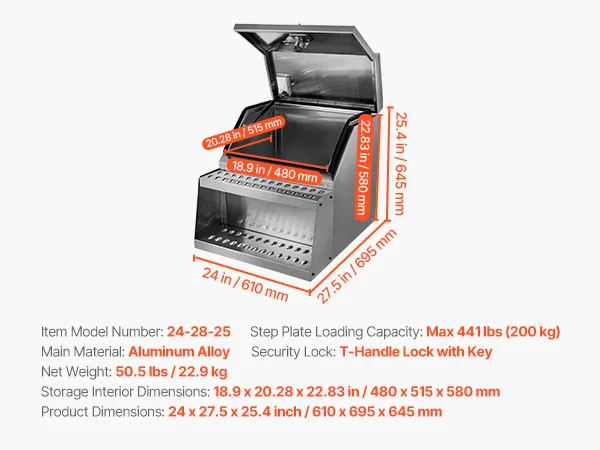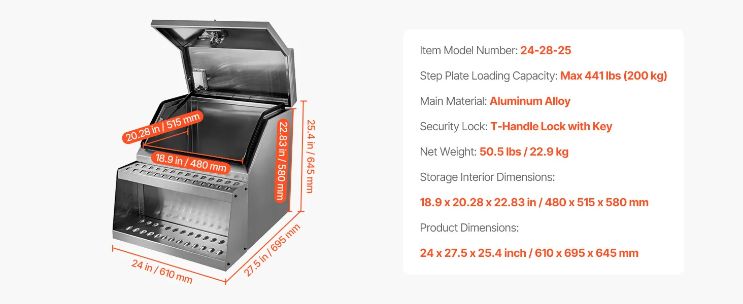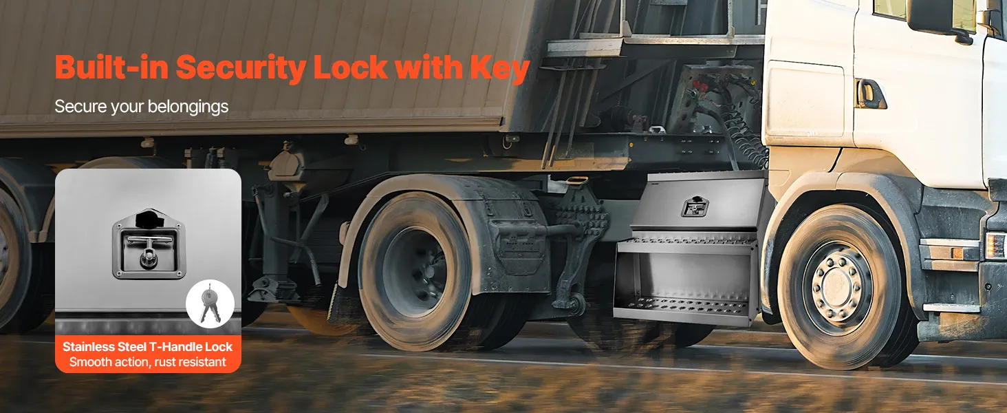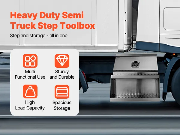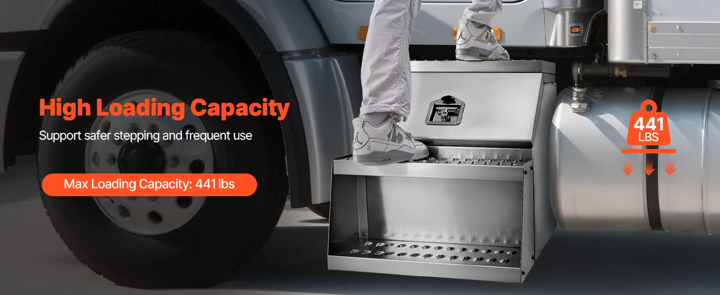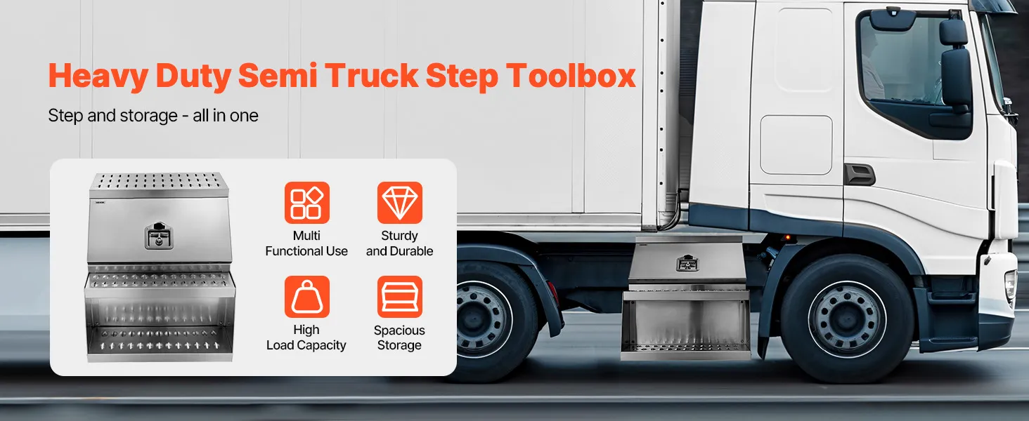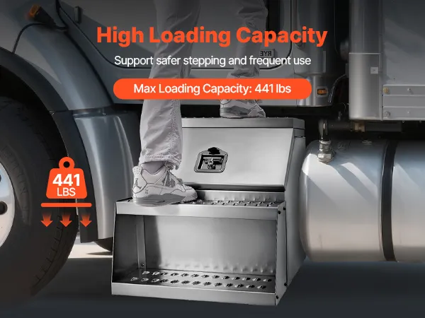 VEVOR semi-truck step tool box combines heavy-duty structure, safe steps, and secure storage in one versatile unit. Crafted from high-strength aluminum alloy, it supports up to 200 kg to ensure stable entry and exit for drivers, and features a spacious strorage interior with a lock and keys.