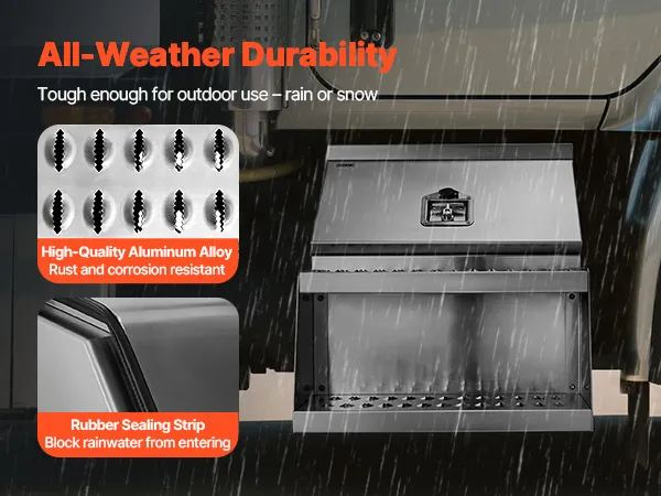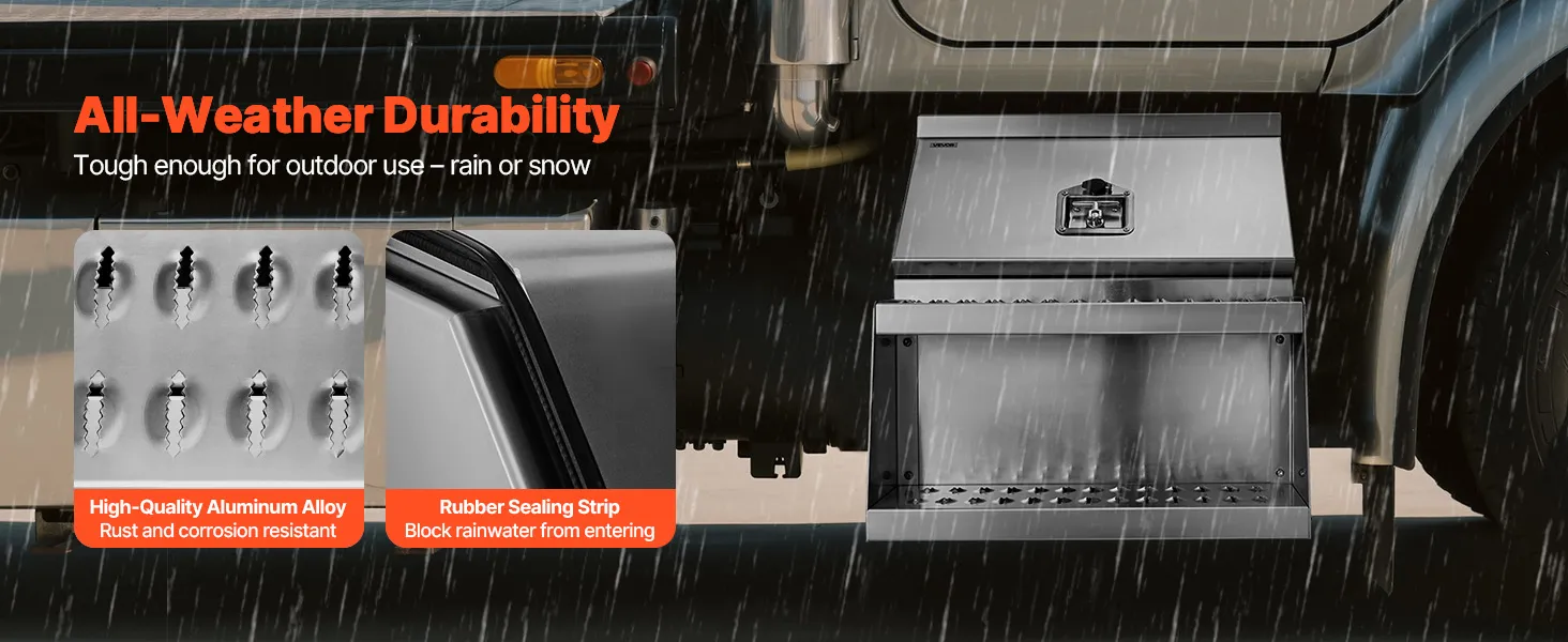 High-quality aluminum alloy construction offers excellent corrosion and rust resistance. And the rubber sealing strips effectively blocks rain and dust from entering the box, keeping the tools safe and dry.
