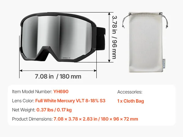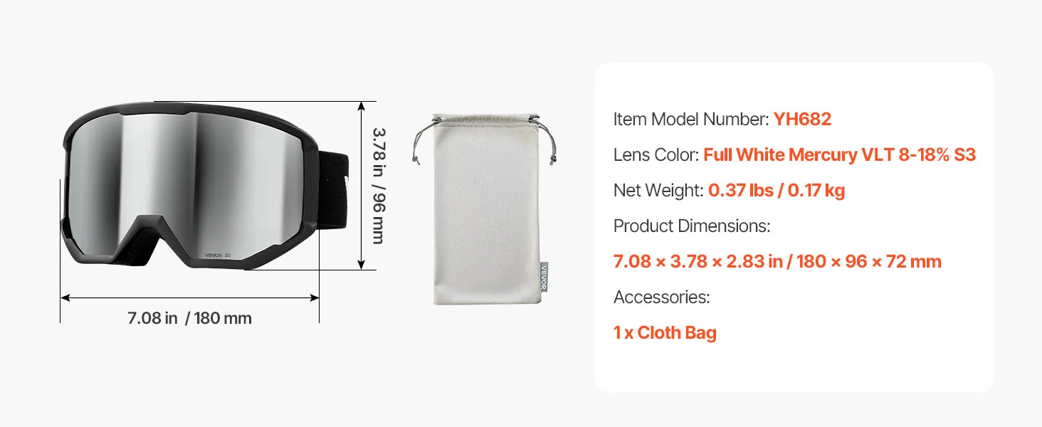 VEVOR Ski Goggles, Cylindrical Lens with Silver Mirror Revo Coating, OTG Anti fog Snow Goggles for Men Women Youth, TPU Frame & Ventilation Structure, Suitable for Skiing, Skating, Snowboarding, Cycling