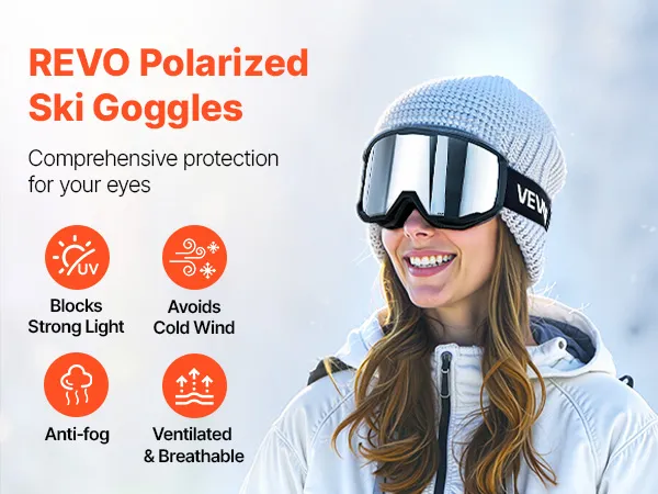 These Revo ski goggles block harsh sunlight and reduce snow glare to help prevent snow blindness. They shield you from cold wind, keep your view fog-free, and maintain fresh airflow so you can enjoy every run with confidence.