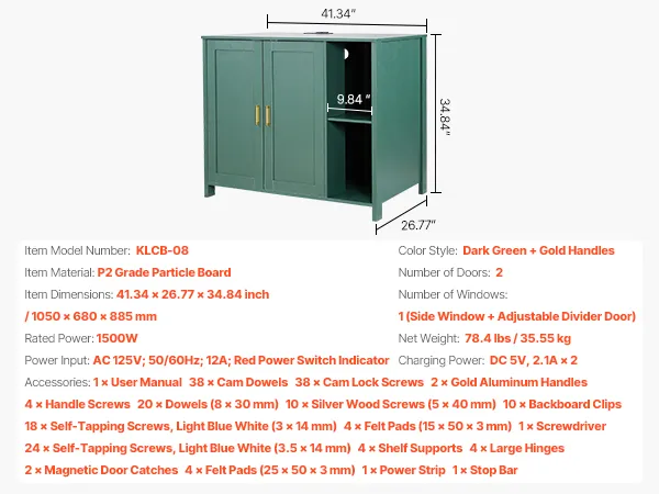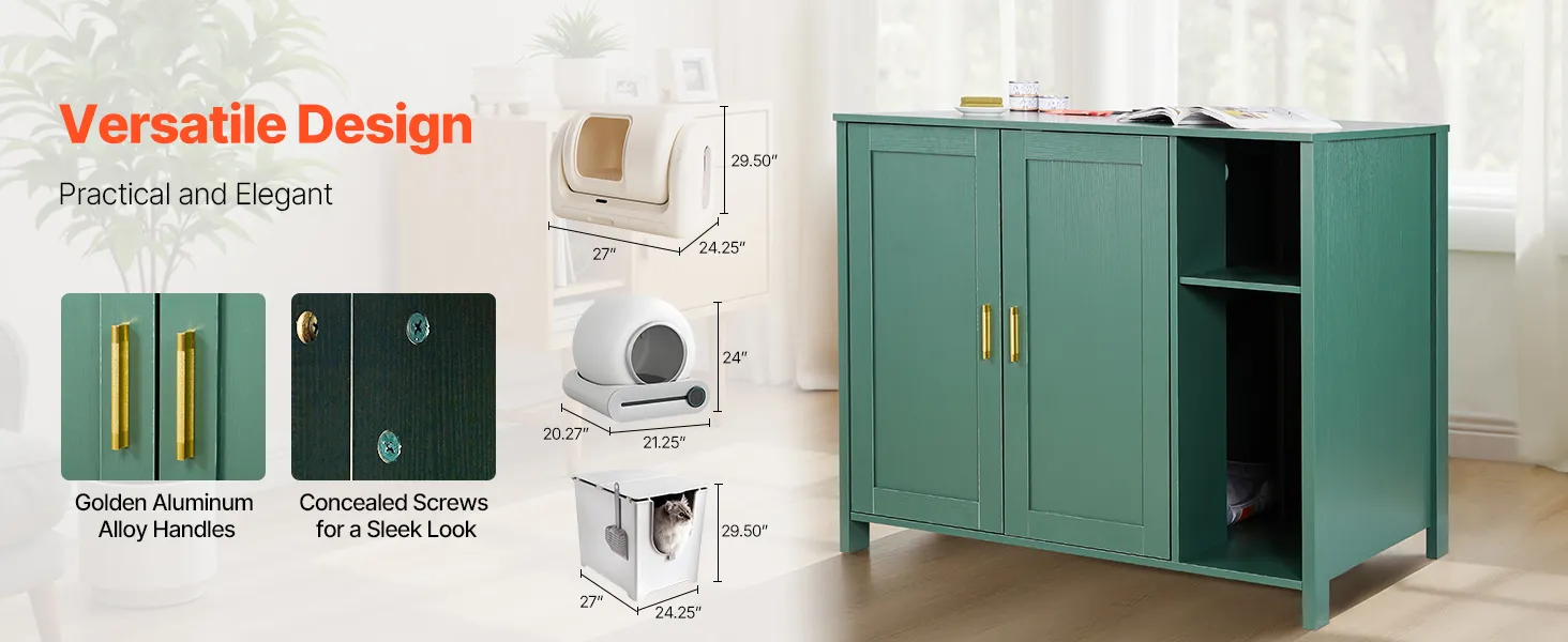 Our cat litter robot enclosure features a vintage green cabinet body paired with gold aluminum alloy handles for a luxurious touch and function. Concealed screws offer a clean, refined finish that enhances overall aesthetics.