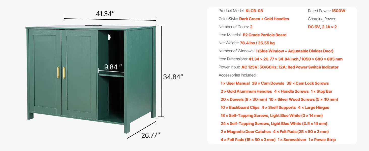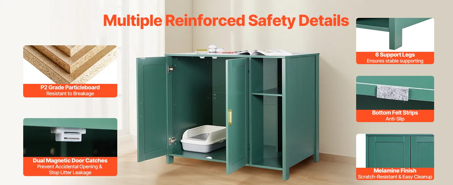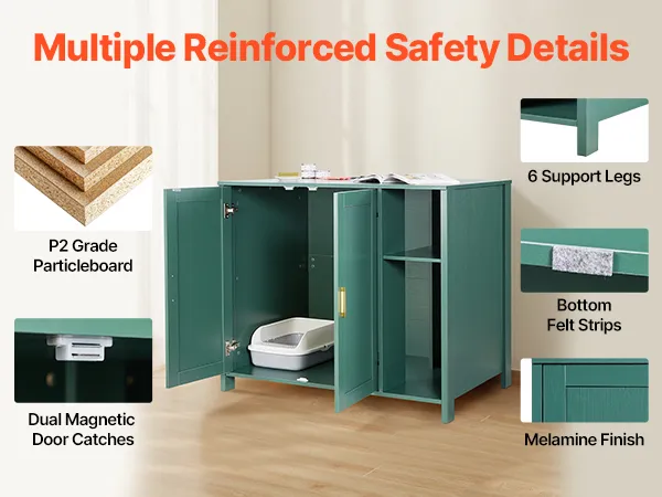 Made from P2-grade secure, durable panels with a melamine finish, plus a metal latch, aluminum alloy handles, anti-slip felt pads, and magnetic doors. The hidden litter robot cabinet with six supporting legs ensure stable, wobble-free load-bearing performance, even with cat scratching.