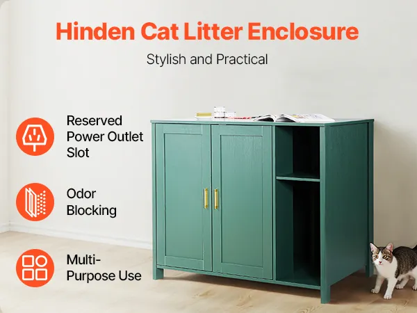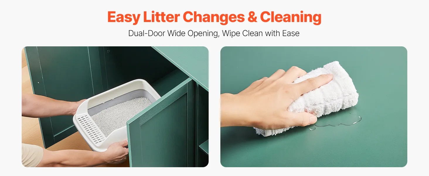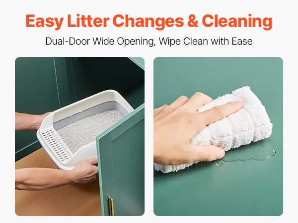 The wooden cat litter box enclosure features dual front doors open wide for easy removal of the litter box. The waterproof, urine-resistant finish wipes clean effortlessly, saving time and effort.
