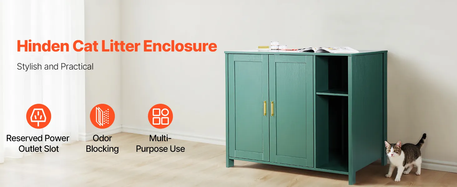 Hidden cabinet design keeps odors contained and mess out of sight, blending into your home. Built for stability, secure for cats to jump on. Spacious interior fits most automatic litter boxes and works for multi-cat homes. Includes a drawer for organized storage and power outlet for easy connection.