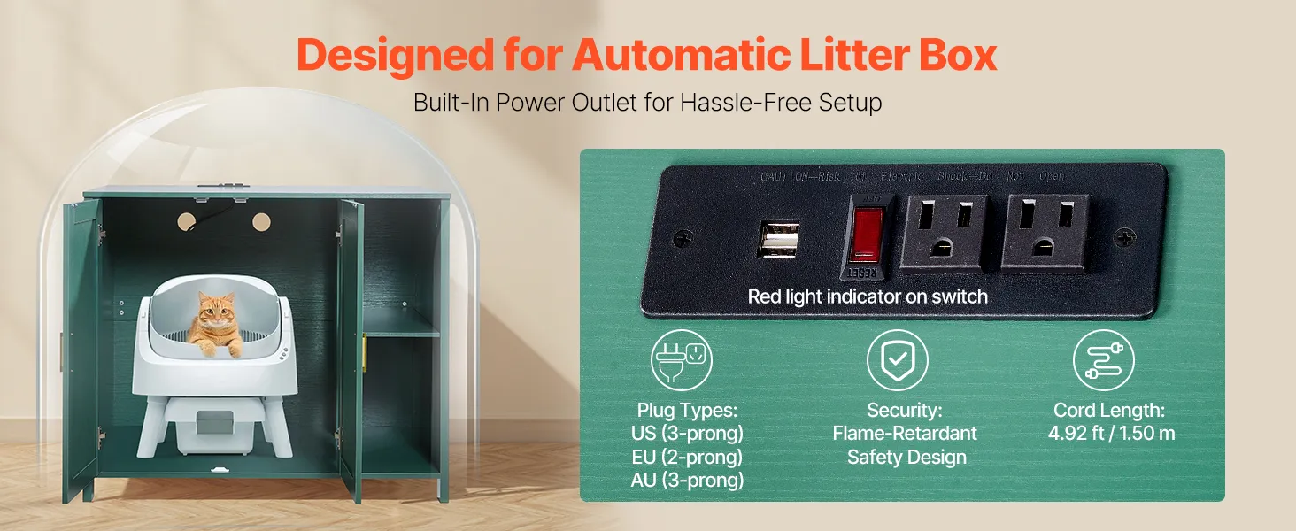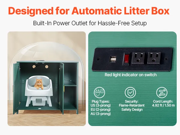 Our automatic litter box enclosure includes a three-prong outlet designed for automatic litter boxes, compatible with US plugs. Comes with flame-retardant protection and a red power switch for secure, convenient use.