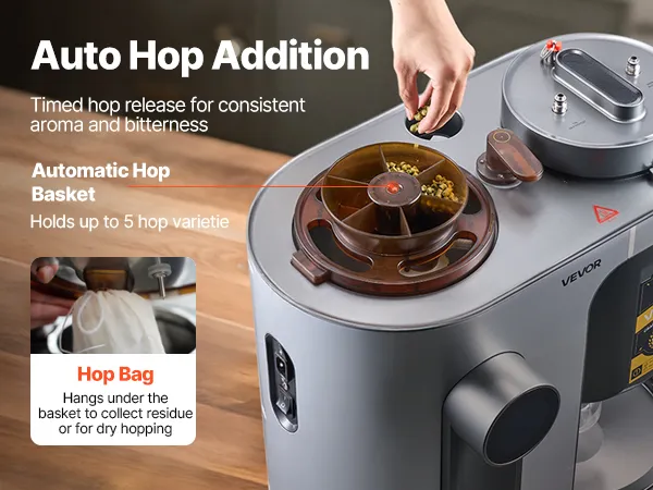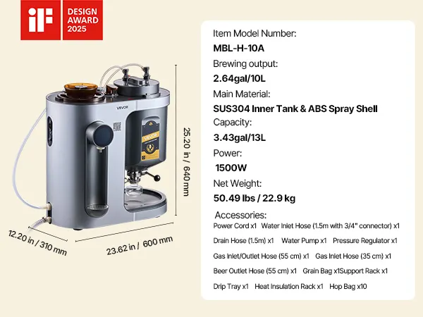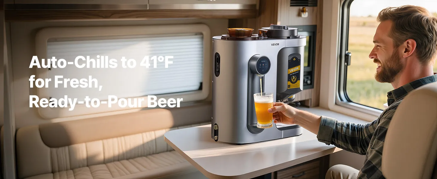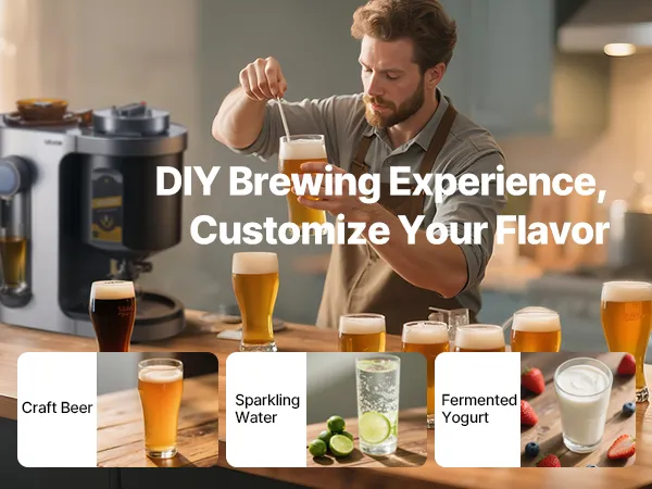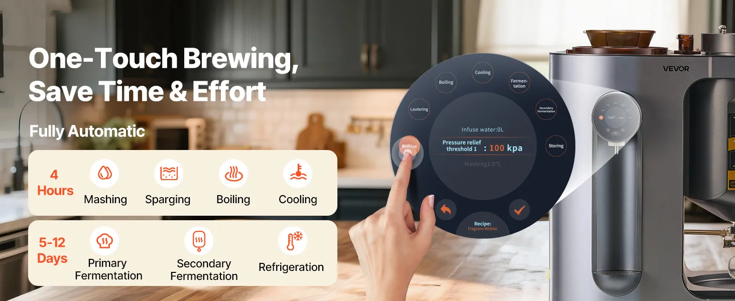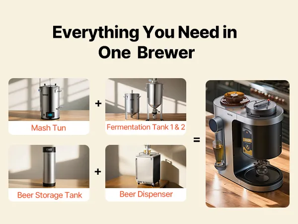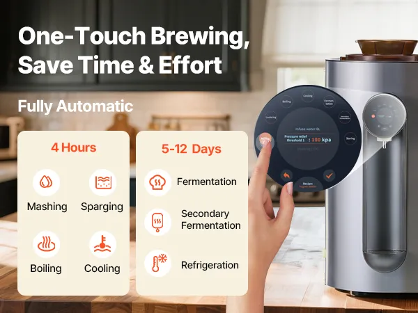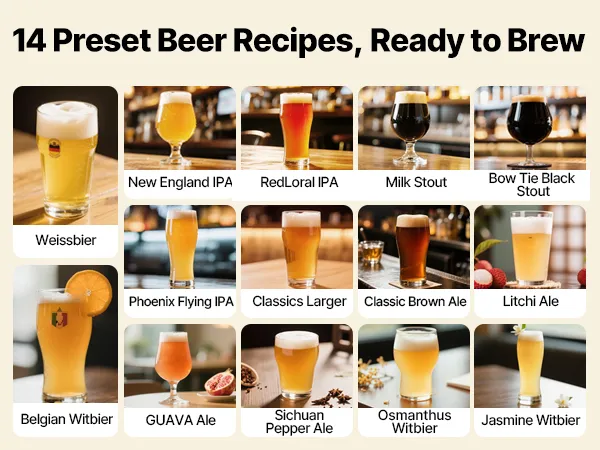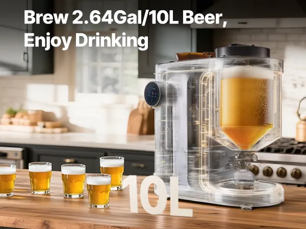 Brew beer easily at home with this all-in-one machine. Fully automatic from mashing to bottling, one-touch start, and clear LCD guidance. 14 built-in recipes plus DIY mode for custom flavors—ideal for beginners and craft beer lovers.