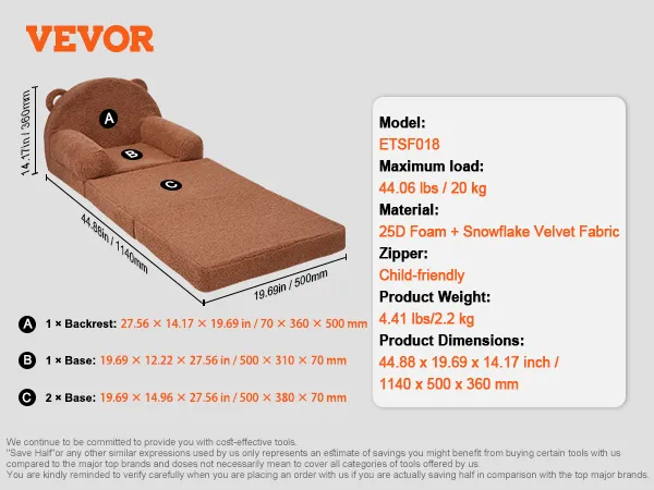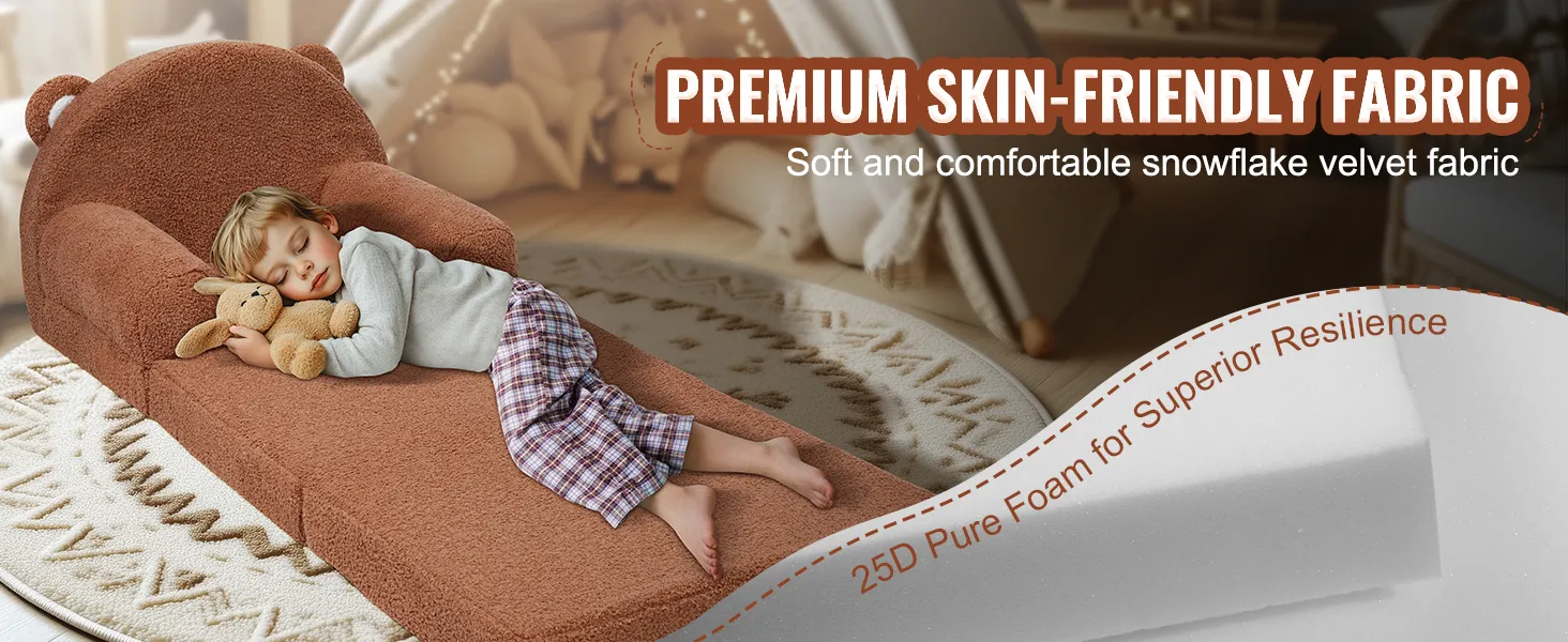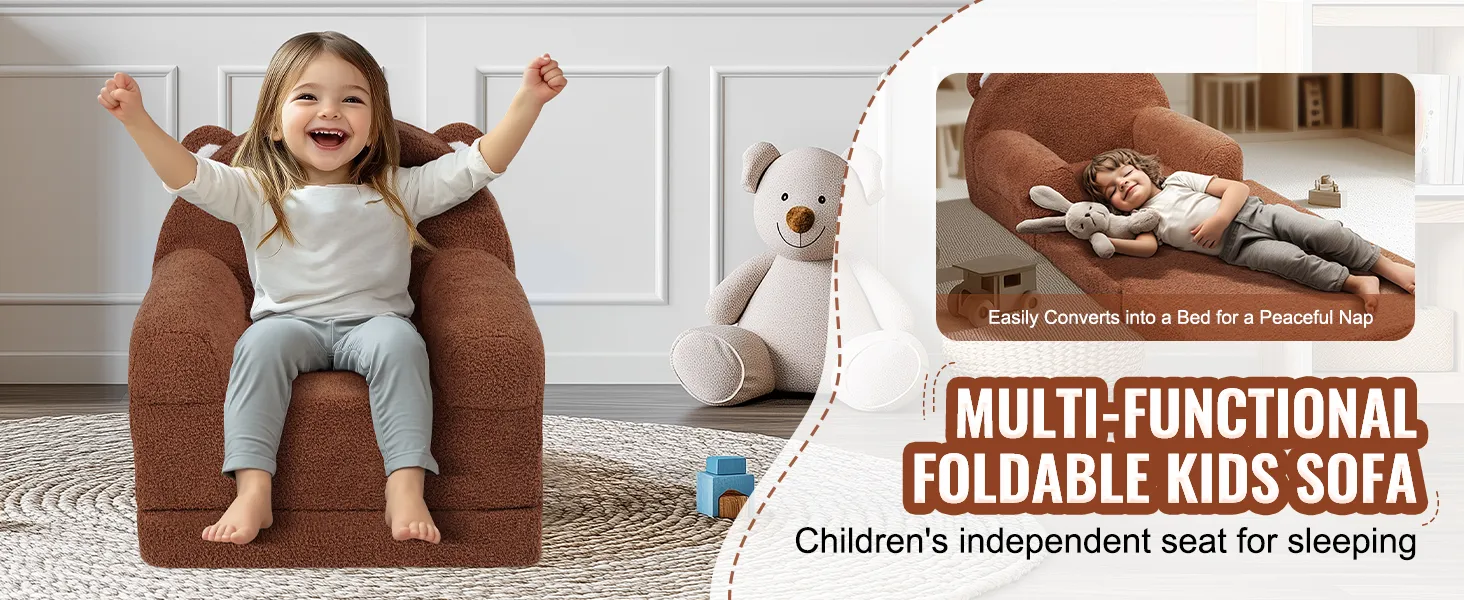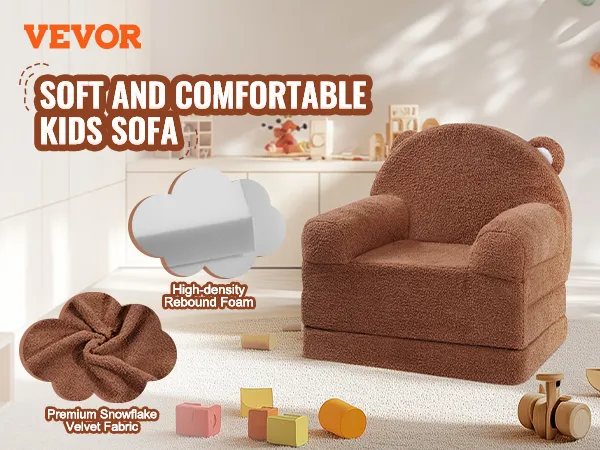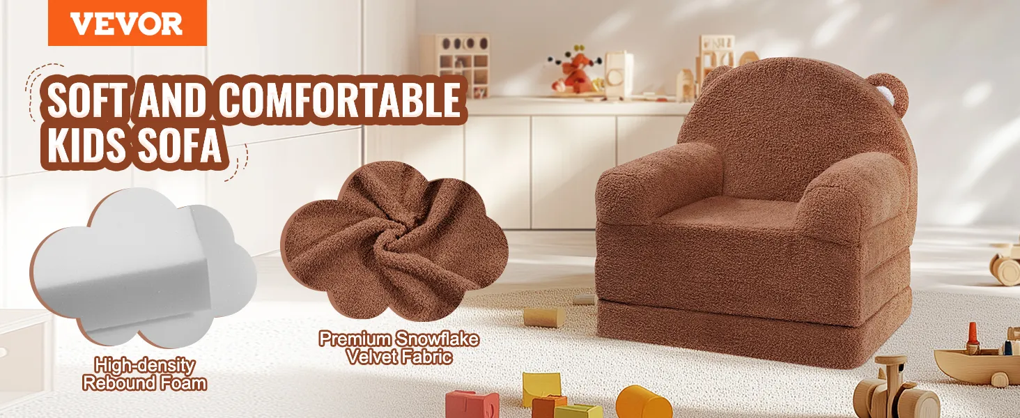 VEVOR Складное 2-в-1 Детское Кресло-Шезлонг и Диван, Мягкий Мультяшный Дизайн, Коричневый, Съёмный Моющийся Чехол